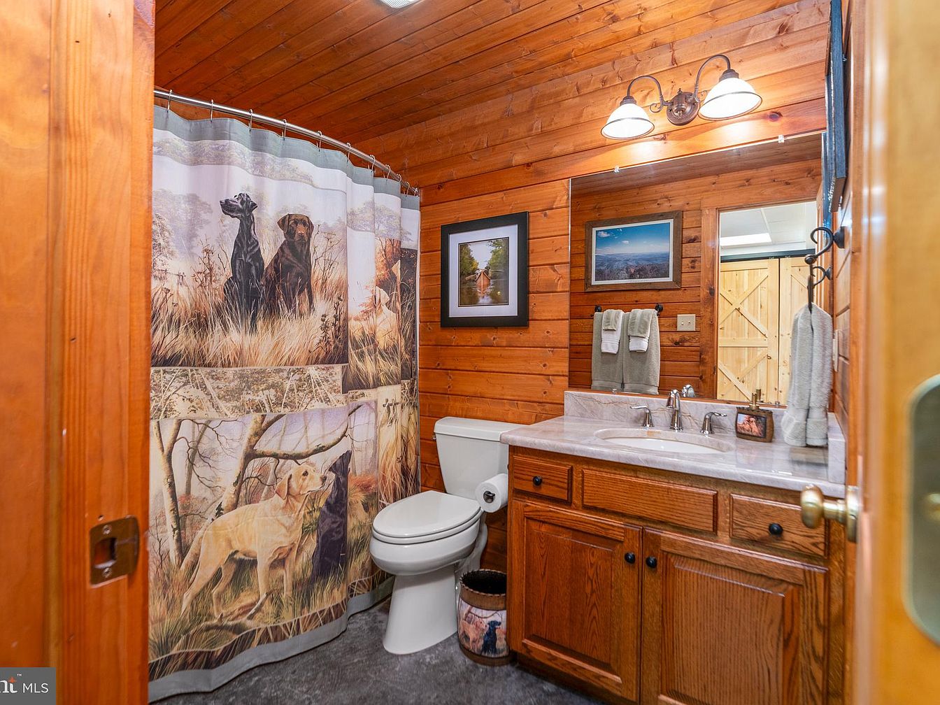 This cozy bathroom features wooden paneling that creates a warm atmosphere. The dark wood walls are complemented by a light-colored marble countertop with dual sinks, offering functionality and elegance. A decorative shower curtain, depicting dogs in a scenic landscape, adds a personal touch. Above the sinks, two industrial-style light fixtures illuminate the space. Framed artwork enhances the rustic charm, while neatly hung towels provide a practical accessory. The flooring contrasts with the wood, featuring a darker tone, and a wooden door leads to the adjoining area, completing this inviting and charming small bathroom.