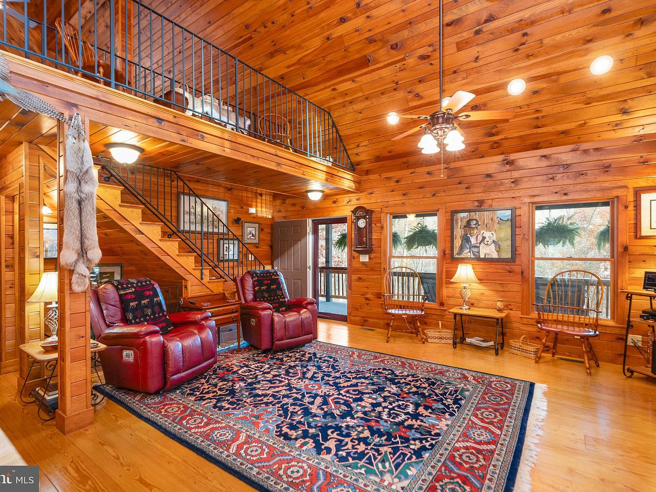 Bright and inviting, this living room features a vast open layout enhanced by wood-paneled walls and ceiling, creating a warm atmosphere. A rich area rug adorns the wooden floor, providing color and texture. Two plush red recliners, accented with patterned pillows, face each other in a cozy arrangement. A staircase with dark wood railings leads to a loft area, while natural light floods through large windows adorned with greenery. Artwork adorns the walls, contributing to the rustic charm, and traditional wooden rocking chairs invite relaxation. A stylish ceiling fan and subtle lighting complete the inviting ambiance.