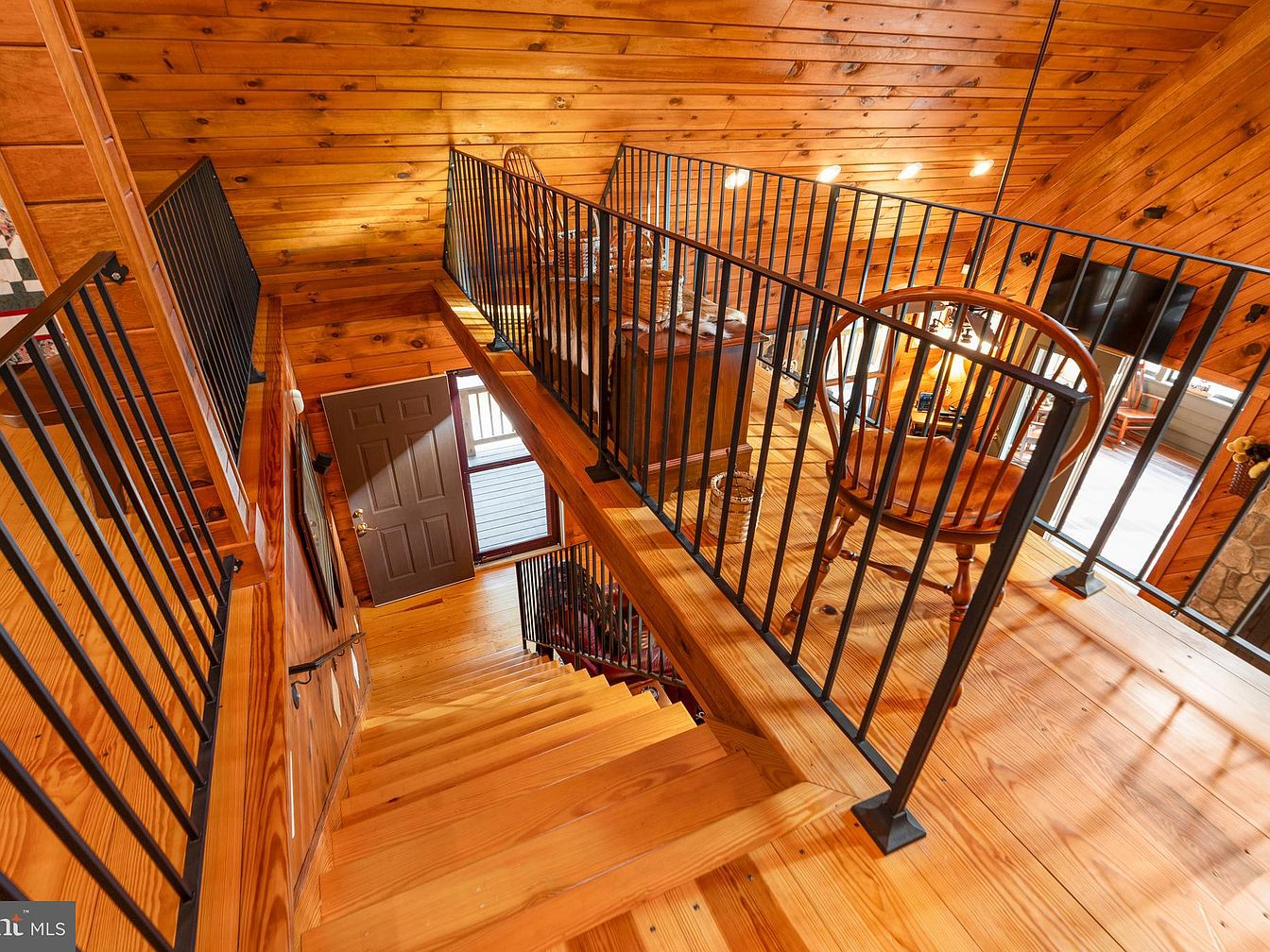 This space features a warm, inviting staircase landing with rustic wooden flooring and walls made of rich, natural wood planks. Black wrought iron railings add a modern touch while providing safety and contrast. The landing showcases a large window illuminating the area with natural light, creating a welcoming ambiance. A wooden chair with a classic design sits near the railing, complementing the homey feel. The layout is open, with a glimpse of the living area below, where additional wooden furniture and decor suggest a cozy, family-oriented atmosphere. Overall, the aesthetic balances rustic charm with contemporary elements.