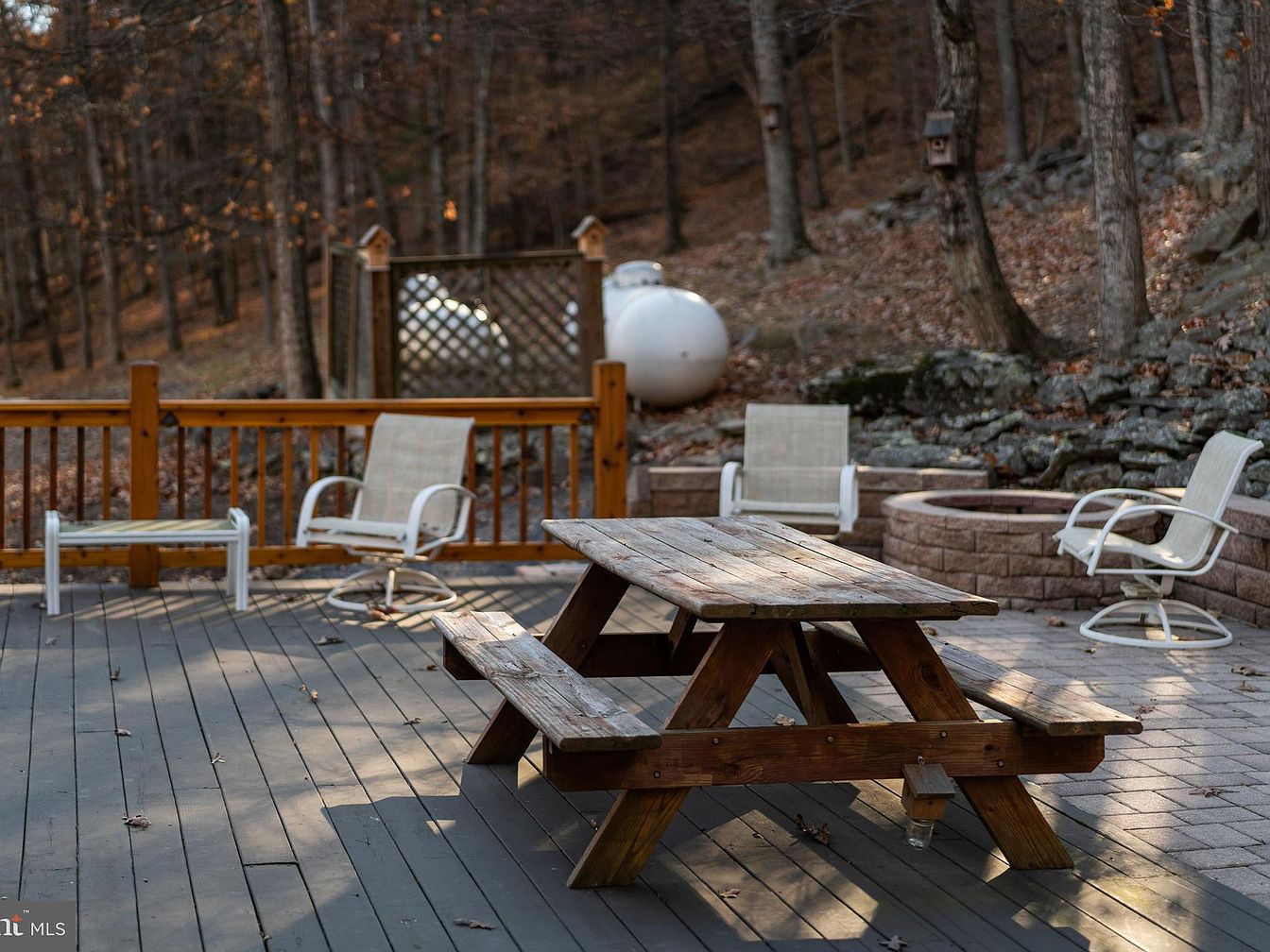 A rustic patio area is showcased, featuring a weathered wooden picnic table resting on a spacious gray deck. Surrounding the table, several white patio chairs invite relaxation. The backdrop is a serene wooded landscape, with trees displaying autumn foliage and a layer of fallen leaves on the ground. There’s a circular stone fire pit nearby, surrounded by additional seating, enhancing the outdoor gathering space. A wooden railing encloses the area, adding structure, while a lattice panel and a white outdoor tank are visible in the background. The overall aesthetic conveys a warm and inviting atmosphere for outdoor enjoyment.