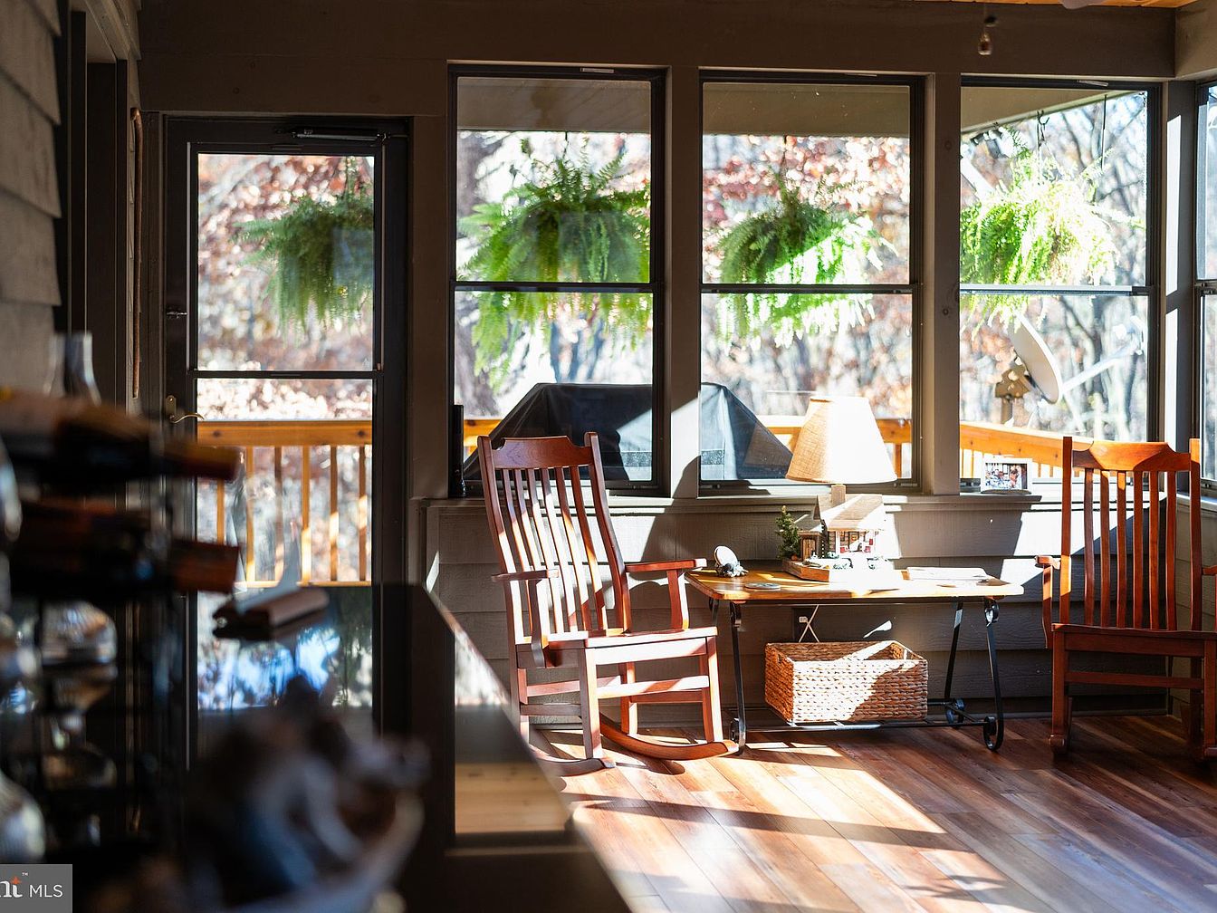 This sunroom features large windows that flood the space with natural light, enhancing its warm wooden tones. The floor showcases rich, polished hardwood, contributing to a cozy atmosphere. Two classic rocking chairs, made from a deep-toned wood, invite comfort, while a small table holds decorative items and a lamp, adding functionality. Green ferns hang elegantly from the windows, introducing a lively touch of nature. A door leads to an outdoor deck, offering a seamless connection to the surrounding landscape. The room’s walls are painted in soft, neutral colors, emphasizing the charming, rustic feel.