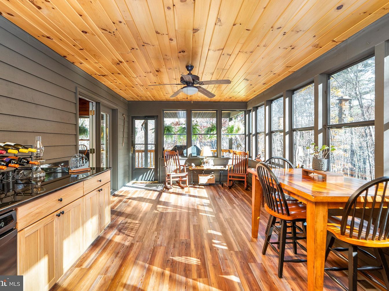This sunroom features warm wooden elements highlighted by a ceiling of natural pine planks, creating an inviting and cozy atmosphere. The walls are painted in a neutral gray, which contrasts beautifully with the rich hues of the wooden flooring. Large windows invite ample sunlight, showcasing the surrounding nature, while a ceiling fan enhances airflow. A sleek black countertop is paired with an oak cabinet, housing wine bottles, adding functionality. A large dining table crafted from sturdy wood, surrounded by black, spindle-back chairs, provides a perfect space for gatherings, harmonizing rustic charm with modern comfort.