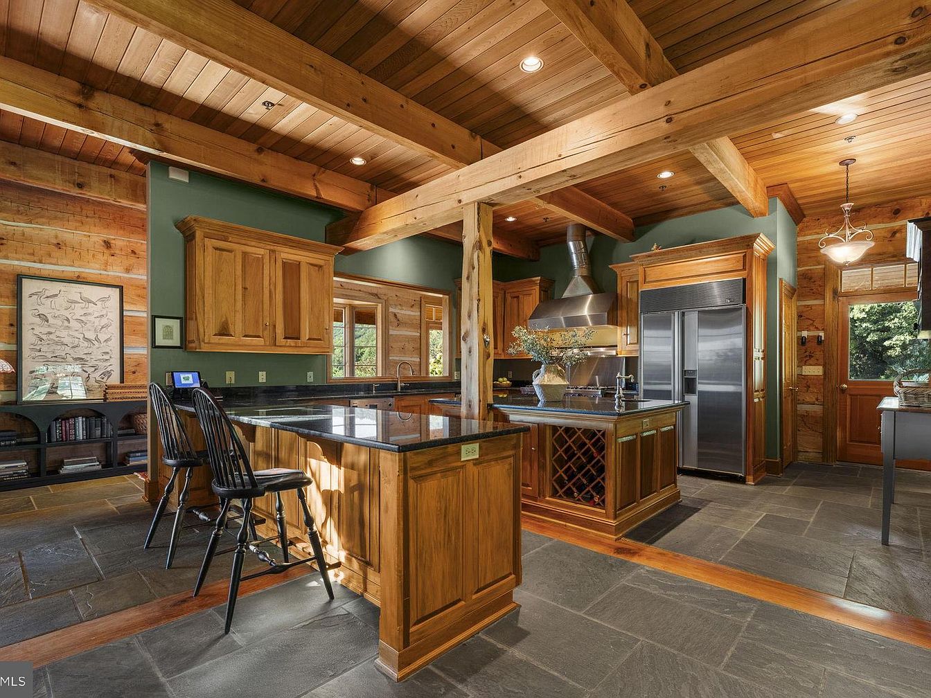 This kitchen features a rustic charm with warm wooden cabinetry and exposed beams, enhancing its inviting atmosphere. Dark granite countertops contrast elegantly with the lighter wood tones, while a large central island provides ample workspace and casual seating. The stainless-steel appliances, including an impressive range and a tall refrigerator, add a modern touch against the traditional cabinetry. Slate flooring offers durability and a textured look, complemented by a subtle area rug near the island. Natural light floods in through windows adorned with simple treatments, creating a bright and cheerful environment, perfect for culinary gatherings.