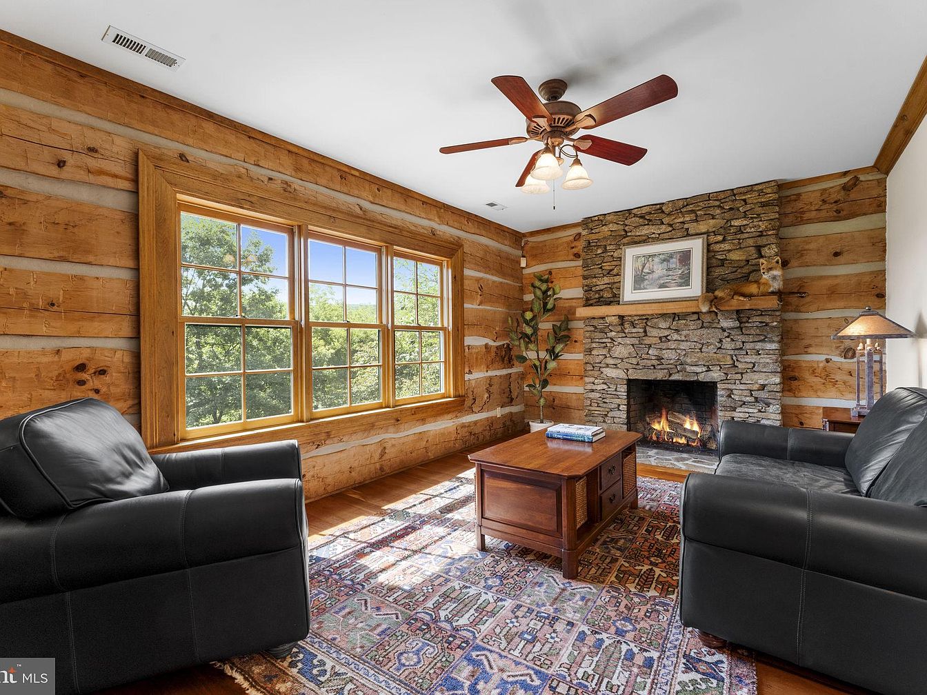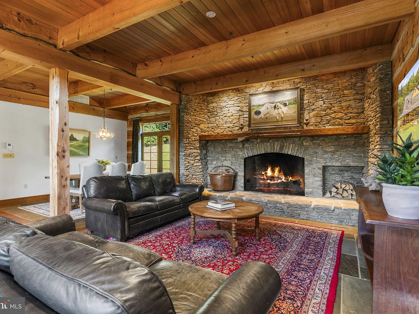 Bear Wallow Farm, located in Huntly, VA, is a distinctive circa 2000 handcrafted timber log home set within 42 acres of scenic landscapes. This 5,750 sq. ft. residence exemplifies modern rustic design, featuring natural materials like pine and stone, and incorporates vaulted ceilings, expansive windows, and a stunning stone fireplace. Recently renovated in 2023, the primary bath boasts luxury finishes. The property includes two guest cabins, a well-appointed equipment barn, and a woodworking shop. Priced at $3,500,000, this estate harmonizes with its environment, offering opportunities for equestrian facilities or gardens, while being conveniently 20 minutes from local amenities in Little Washington, making it an exceptional Rappahannock retreat.