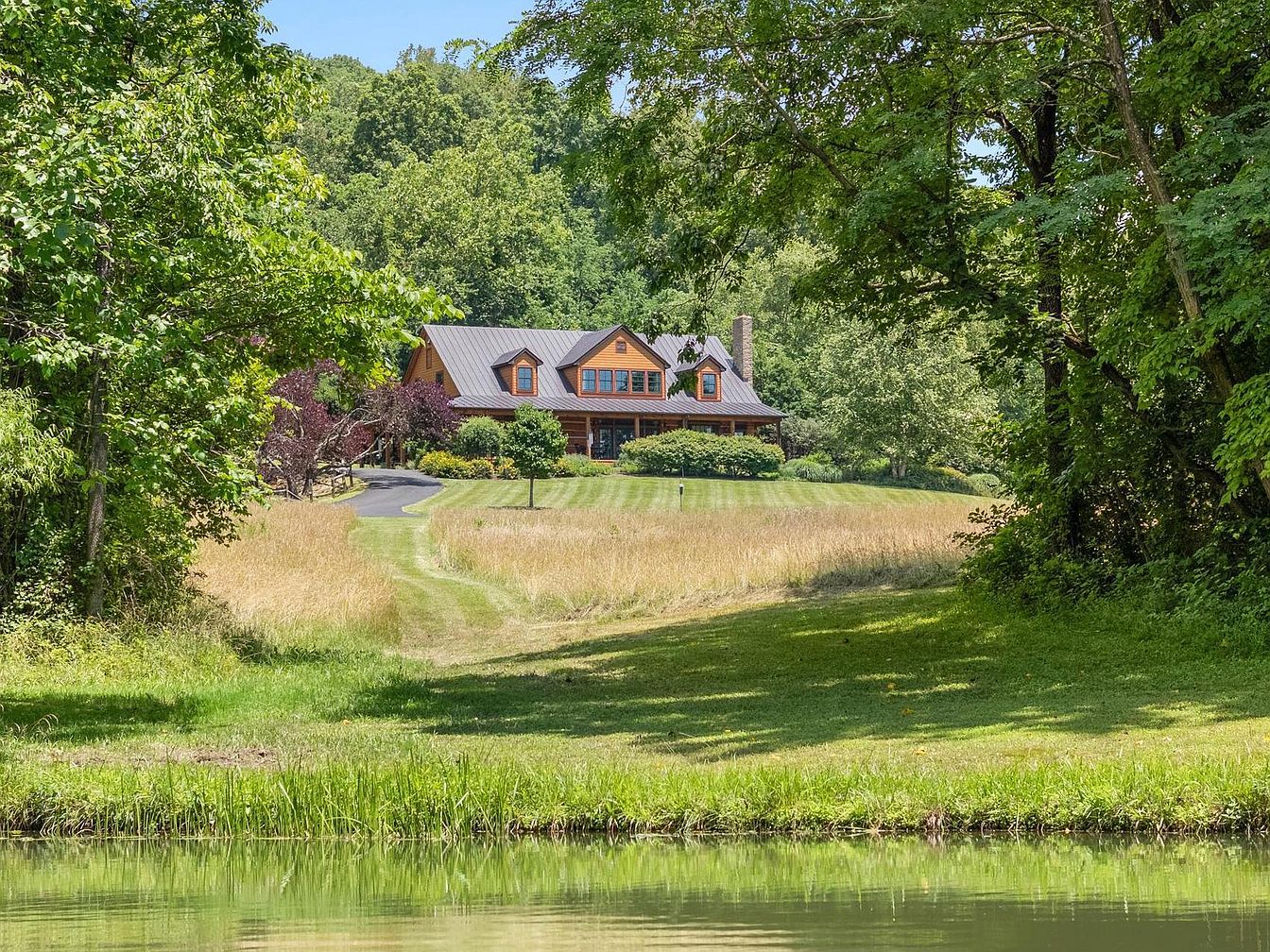 The image shows a charming historic American home set amidst lush greenery. The structure combines wood and stone, providing a warm, rustic appeal. A pitched metal roof enhances its traditional character, while large windows adorned with orange accents invite natural light. The entrance features a welcoming porch, surrounded by blooming flowers and manicured shrubs. A gravel driveway leads up to the house, complemented by a gentle slope of golden grass. The surrounding trees frame the property, creating a serene atmosphere. The reflection in the nearby pond adds a peaceful touch, enhancing the home’s tranquil setting.