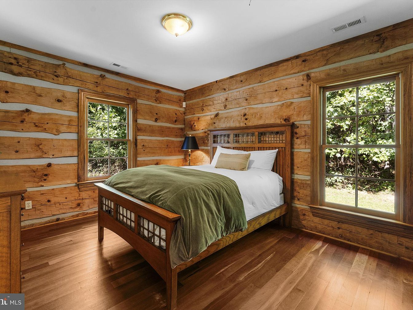 This cozy bedroom features rustic log walls that give a warm, inviting atmosphere. The color scheme combines natural wood tones with a soothing green thrown on the bed, enhancing the room’s earthy feel. A wooden bed frame, detailed with a lattice headboard, complements a matching nightstand, which holds a stylish lamp. Natural light pours in through two large windows, framed with wooden casings, showcasing views of lush greenery outside. The room maintains an open feel with smooth hardwood flooring, emphasizing simplicity and comfort while highlighting its historical charm.