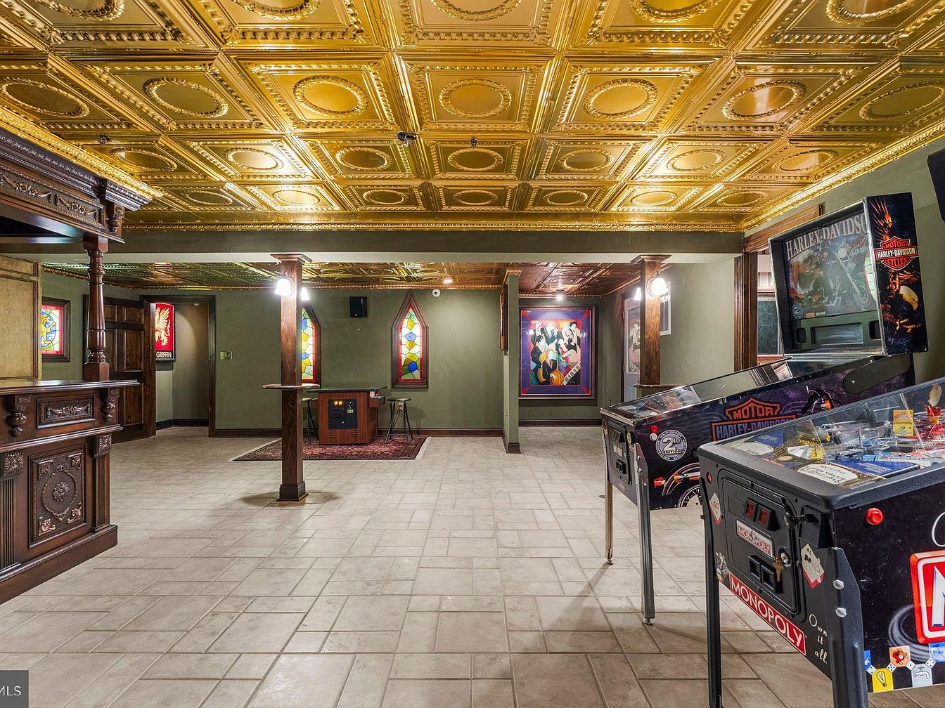 This game room features an opulent gold coffered ceiling, drawing immediate attention. The spacious area is highlighted by intricate architectural details in the ceiling, balanced with warm-toned wooden accents. On one side, a richly carved wooden bar stands, inviting relaxation. Two pinball machines are positioned prominently against a backdrop of colorful stained-glass windows that add vibrancy. Dark green walls provide a cozy atmosphere, contrasted by light-colored tiled flooring, enhancing the room’s brightness. Additional framed artwork adds character and artistic flair, combining leisure and elegance. This sophisticated yet playful space encourages social interaction and entertainment.