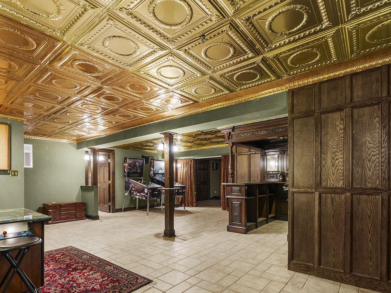 A spacious basement lounge showcasing striking architectural details. The ceiling features an ornate, gold tin design, reflecting light and elegance, contrasting the muted green walls. Natural light enters from a modest window. The flooring consists of large, beige tiles, enhancing the room’s warmth. A rich, dark wood bar with intricate carvings stands prominently, flanked by wooden support columns. Soft lighting, including wall sconces, creates an inviting atmosphere. A vintage area rug with deep hues anchors the space, complemented by eclectic art pieces and a pinball machine, adding playful charm to this sophisticated retreat.
