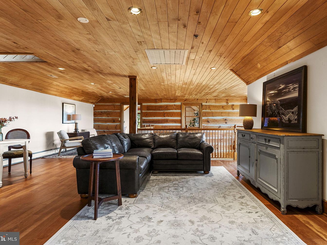 This spacious living room features a warm, inviting atmosphere with a high, wooden ceiling and exposed beams. The floor showcases rich, polished hardwood, complementing a large area rug adorned with intricate patterns. A plush black leather sectional invites relaxation, while a circular wooden side table adds a rustic touch. Across the room, a vintage sideboard painted in a soft gray contrasts beautifully with the warmth of the wood. Natural light filters through the room, enhanced by strategically placed recessed lighting, while framed art pieces add character to the walls, seamlessly blending comfort and style.