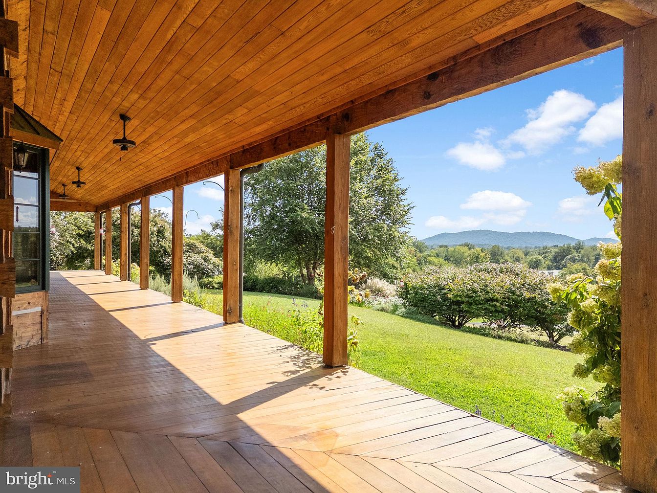 A spacious front porch features warm wooden flooring that complements the rustic charm of the home. Tall, sturdy wooden columns support the expansive ceiling, which showcases rich wood planks running parallel. Soft natural light illuminates the area, highlighting the gentle shadows cast by the columns, creating an inviting atmosphere. Ceiling fans are installed to provide comfort during warm days. The view opens up to a lush green lawn adorned with flowering shrubs, framed by distant mountains under a vibrant blue sky. This outdoor space blends seamlessly with the natural surroundings, perfect for relaxation and entertaining.