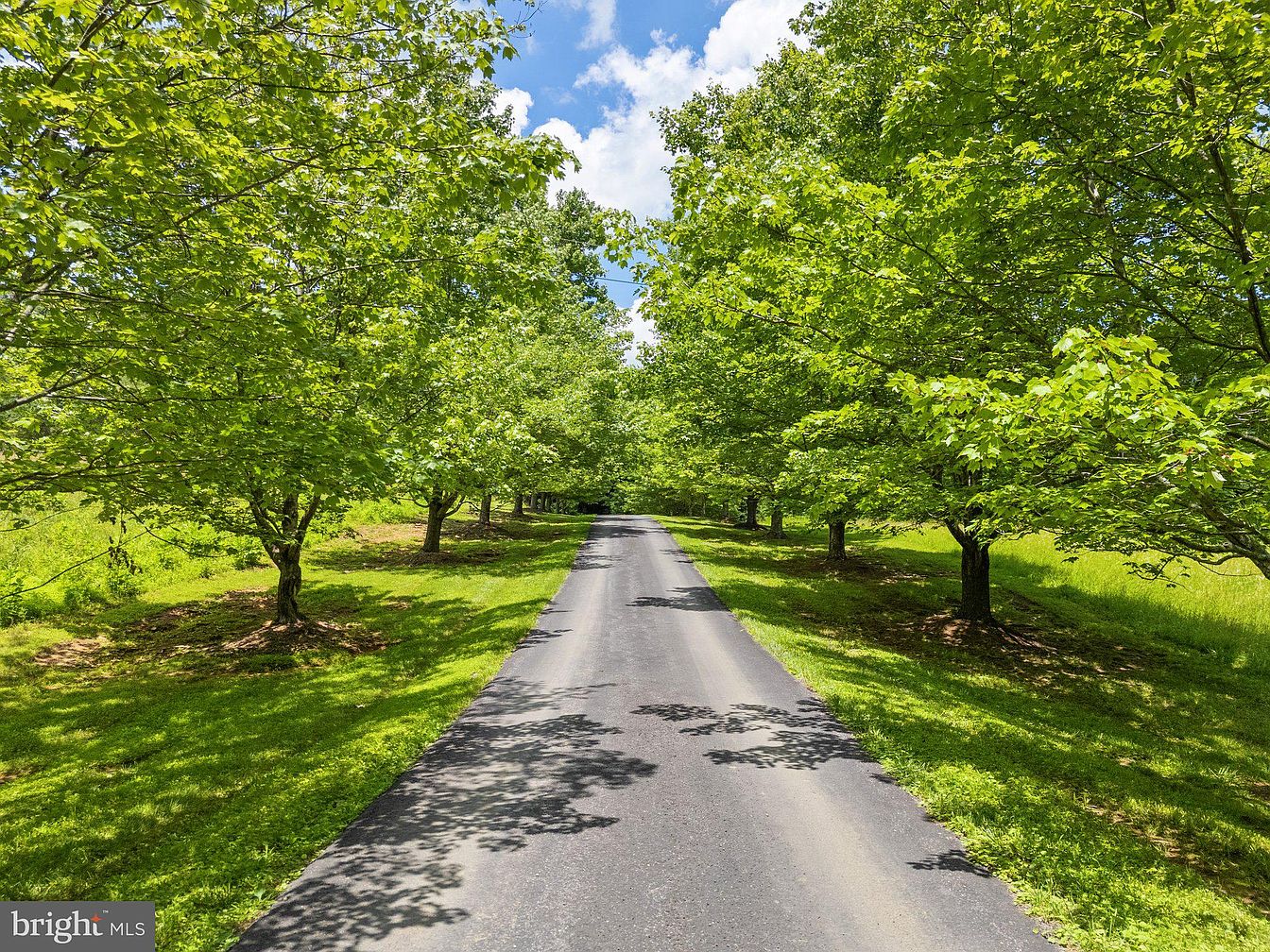 A peaceful driveway is flanked by lush greenery, with vibrant green trees lining both sides. The asphalt path is well-maintained, leading towards the inviting horizon. Sunlight filters through the leaves, casting playful shadows on the surface, adding a dynamic quality to the scene. A few small patches of grass peek through the edges, enhancing the natural feel of the approach. The backdrop features a gentle rise, hinting at the home further in, suggesting a tranquil rural setting. The colors are bright and fresh, embodying the serenity of country living as nature surrounds this welcoming entrance.