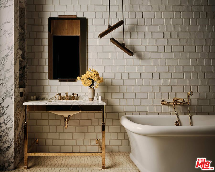 A contemporary bathroom showcases a blend of elegance and minimalism. The wall features a grid of light-colored subway tiles, creating a soothing backdrop. A striking countertop made from white marble is paired with a polished gold faucet and sink, emphasizing luxury. Beside the sink, a glass vase holds fresh yellow flowers, adding a touch of warmth. Above, a rectangular mirror framed in dark wood further complements the gold fixtures. An exquisite freestanding bathtub with a vintage-style faucet sits adjacent on a textured stone floor. Unique pendant lights hang overhead, enhancing the modern aesthetic while providing ambient illumination.