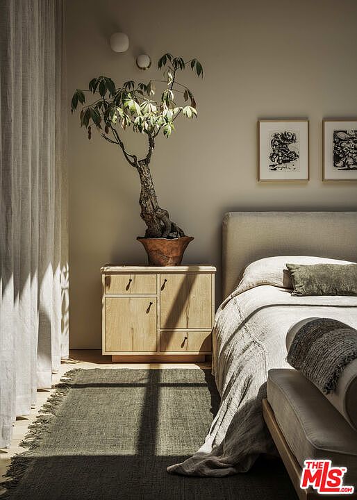 This cozy bedroom exudes a serene vibe with soft, neutral tones dominating the color scheme. A warm wooden nightstand sits beside a plush bed, adorned with layers of textured bedding. Natural light filters through sheer curtains, casting gentle shadows on the floor. A striking bonsai tree adds a touch of greenery, enhancing the organic feel of the space. Above the nightstand, two framed artworks subtly complement the decor. A simple yet elegant area rug lies underfoot, while the smooth wooden floor adds warmth and character, contributing to the room’s inviting atmosphere.