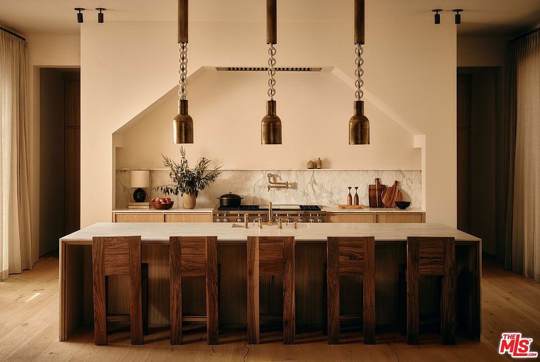This modern kitchen features a sleek, expansive countertop made of light-colored stone, contrasting with rich, wooden bar stools. Above, three stylish pendant lights with metallic finishes enhance the space’s ambiance. The cabinetry showcases a warm wood grain, complemented by a backdrop of white marble with subtle veining. A stainless steel range is framed by the unique sloped wall, creating a focal point. Subtle decorative elements include potted greenery and wooden kitchen accessories, adding warmth to the minimalist design. Soft natural light filters through sheer curtains, creating an inviting and functional culinary environment.
