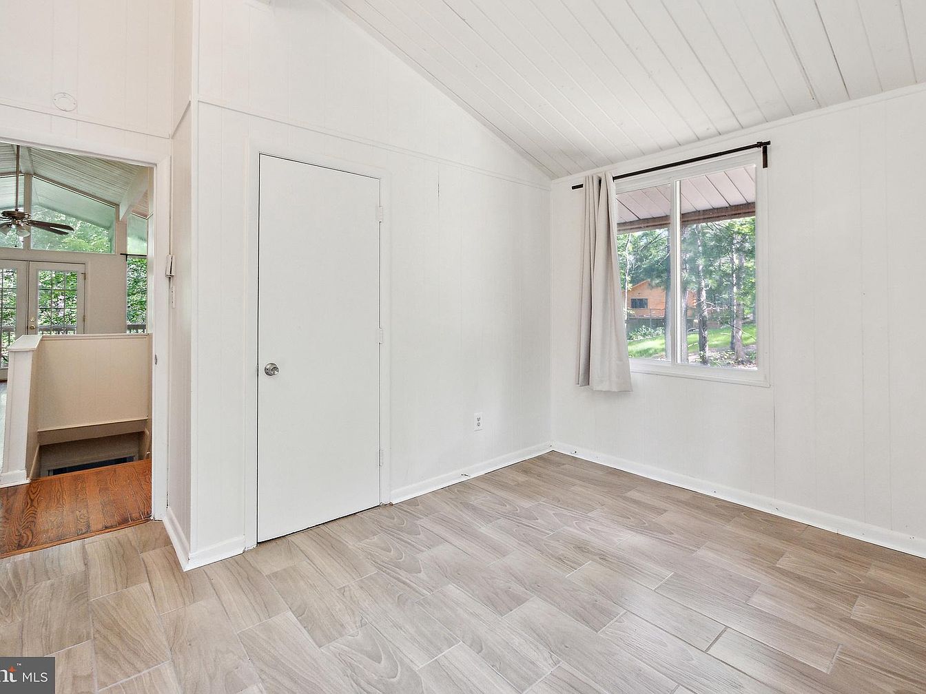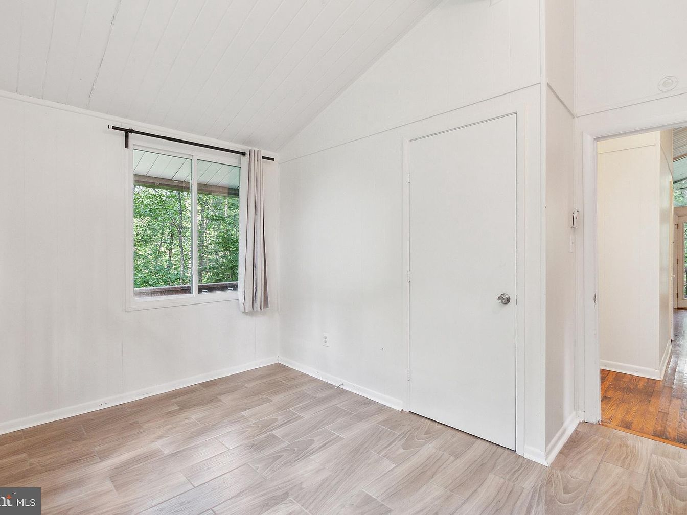 This sunroom features a bright, airy layout with high, sloped ceilings and large windows that invite natural light. The walls are painted white, enhancing the open feeling, while the light wood flooring provides warmth and texture. A doorway leads to a cozy seating area visible through the glass, suggesting a seamless indoor-outdoor connection. One wall displays a simple closet door, maintaining a minimalist aesthetic. A soft, neutral curtain gently frames the window, allowing for privacy while still showcasing the lush green views outside. Overall, the space exudes tranquility and a connection to nature, perfect for relaxation.