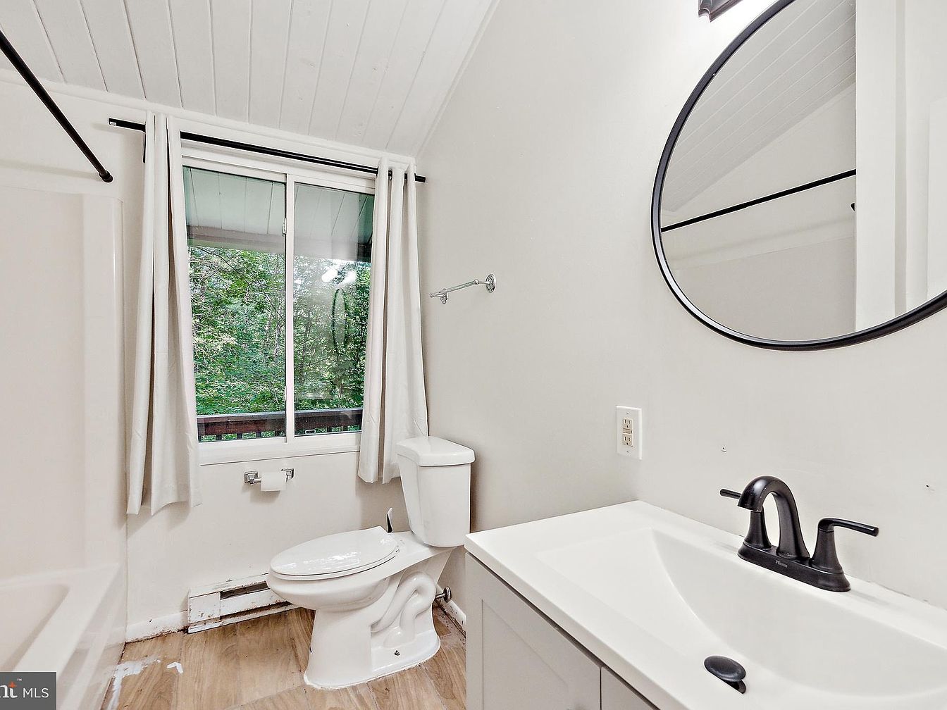 A functional bathroom with a modern, minimalistic design. The room features a sleek white vanity with a simple sink and matte black faucet, enhancing the contemporary aesthetic. A large, round mirror above the sink reflects natural light, complemented by a window dressed in light, flowing curtains that offer a view of the surrounding greenery. The walls are painted a soft white, providing a clean backdrop. A white toilet is positioned alongside the vanity, maintaining an organized layout. Light wood-look flooring contributes warmth, while the ceiling showcases a tongue-and-groove design, adding character to the space.