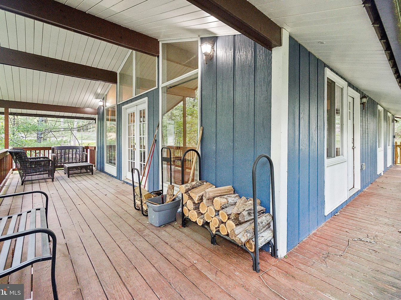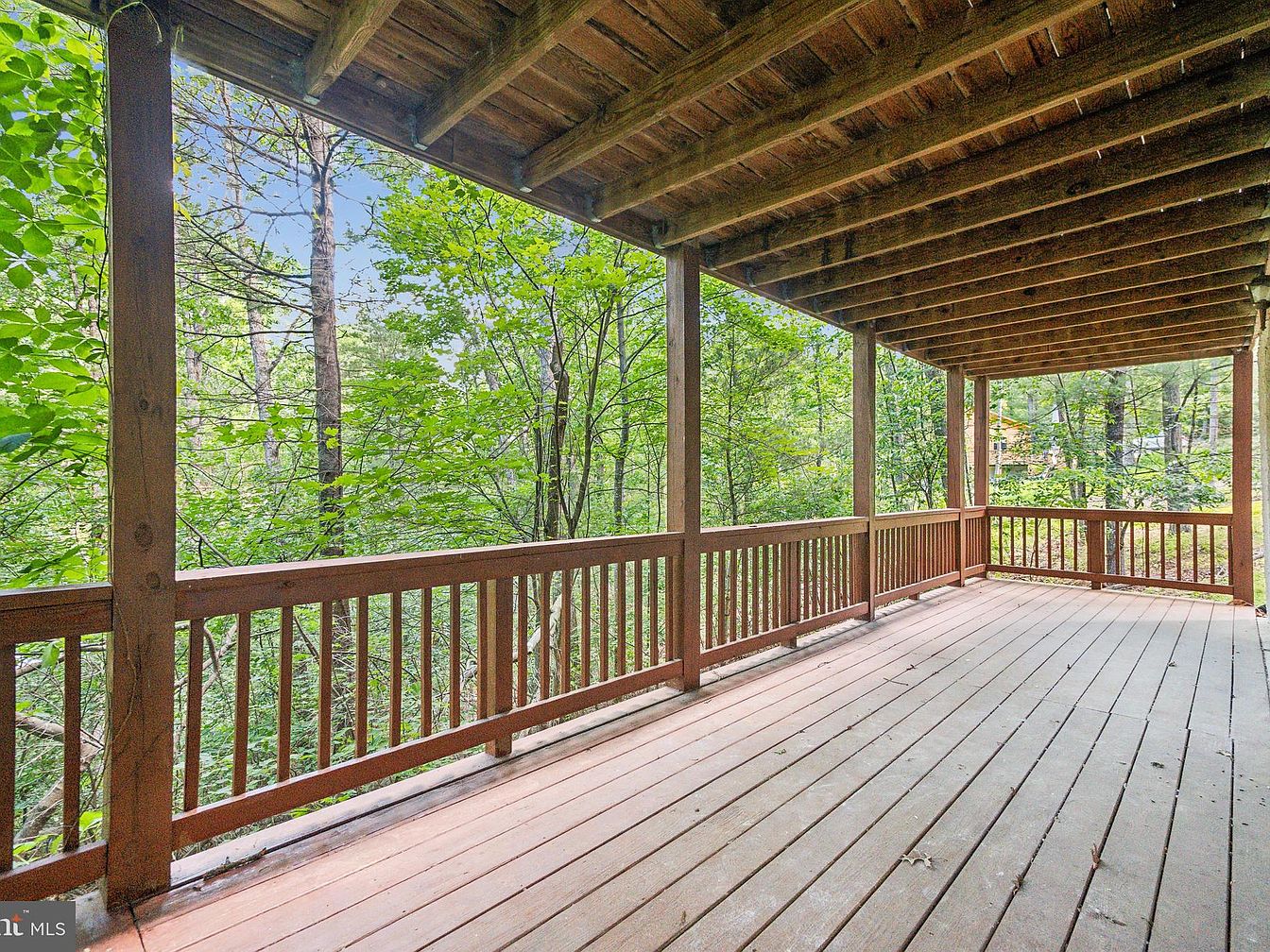 This covered porch features a rustic wooden structure with exposed beams overhead and sturdy railing surrounding the perimeter. The wooden flooring is well-maintained, providing a warm, inviting space. Soft natural light filters through from the surrounding trees, creating a serene outdoor ambiance. The backdrop is dense greenery, enhancing the connection to nature. The space appears functional for relaxation or social gatherings, with ample room for outdoor furniture. The earthy tones of the wood harmonize with the vibrant greens from the foliage, adding a tranquil aesthetic that encourages outdoor living while feeling integrated with the natural environment.