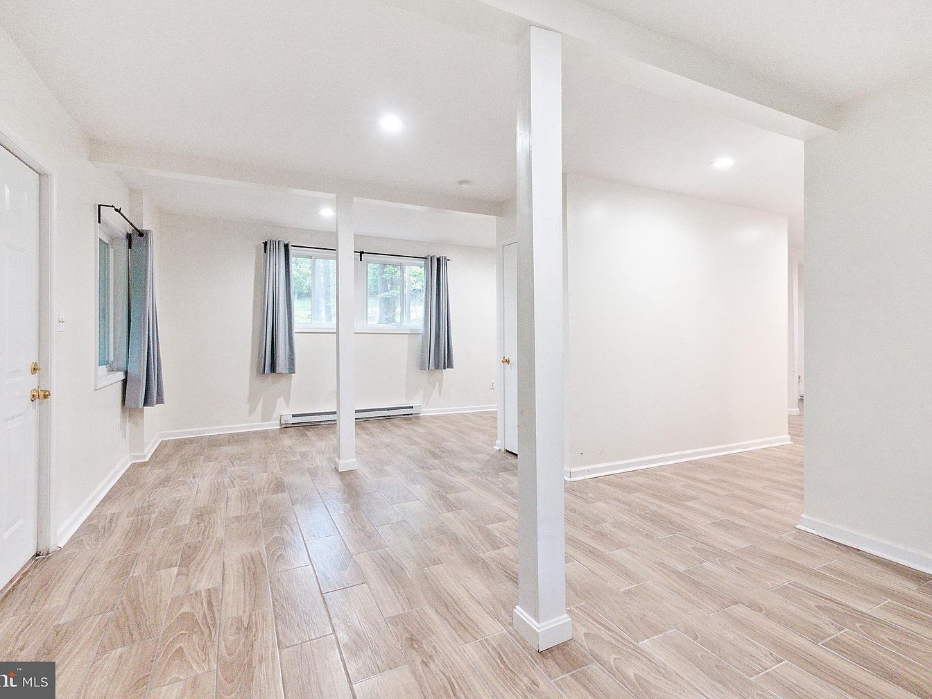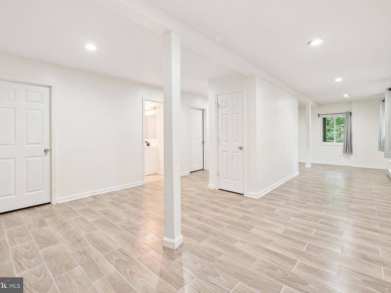 A spacious, light-filled basement area showcases a modern aesthetic with neutral colors. The flooring features elegantly grained, light wood-like tiles that extend across the room, enhancing the sense of openness. Bright white walls reflect natural light from a nearby window, adding to the airy atmosphere. The layout includes multiple doors, leading to additional spaces, with simple, sleek hardware. Central support columns contribute subtle architectural interest without overcrowding the space. Soft gray curtains frame the window, providing a touch of texture while maintaining the minimalistic theme, perfectly suited for various uses like a recreational area or additional living space.