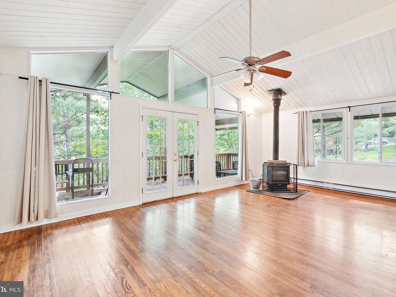 A spacious living room characterized by vaulted ceilings and large, angled windows that invite natural light, creating an airy feel. The walls are painted in soft white, complementing the rich, polished wooden floor. A prominent black metal wood stove stands centrally, adding warmth and a rustic element. Flanking the stove, large windows provide views of the surrounding greenery. Light beige curtains soften the look, enhancing the room’s cozy atmosphere. Opposite the stove, French doors open to a deck, merging indoor and outdoor spaces seamlessly. The overall aesthetic marries modern simplicity with natural beauty.