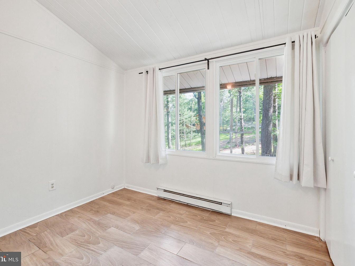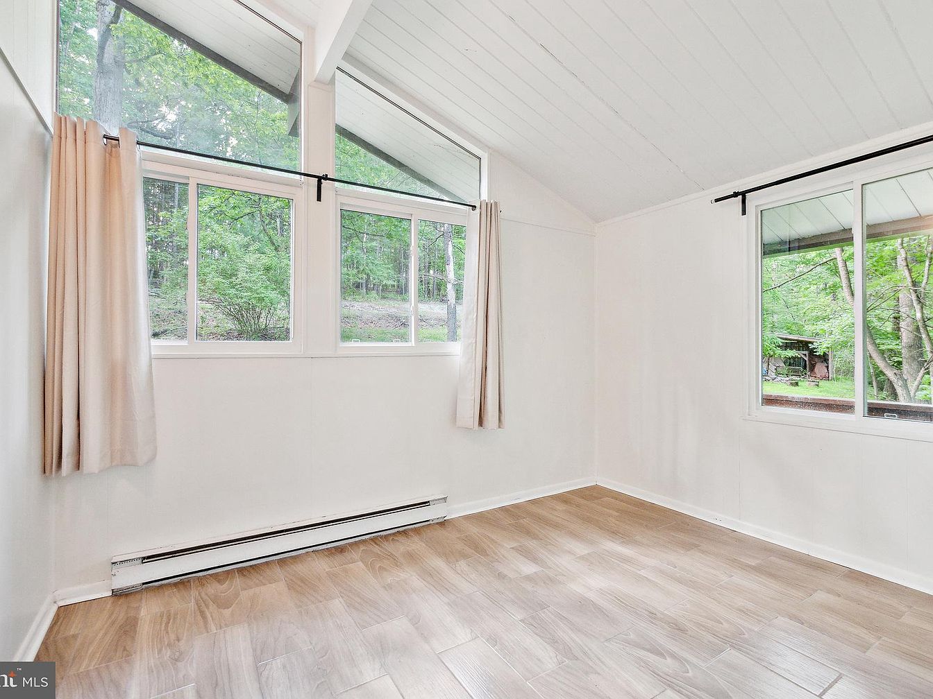 This sunroom features a cathedral ceiling with exposed beams and a warm wood finish, enhancing a spacious and inviting atmosphere. Large windows on two walls illuminate the room, allowing natural light to flood in, while offering views of the lush greenery outside. The walls are painted a clean white, contrasting with the rich, tan wood flooring that mimics the look of tiles. Two simple beige curtains frame the windows, softening the sunlight. The room remains minimally furnished, creating a tranquil space ideal for relaxation or enjoying morning coffee, seamlessly connecting indoor comfort with outdoor beauty.