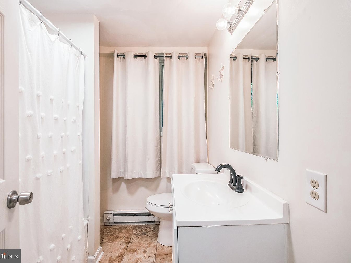 This bathroom features a concise layout emphasizing functionality and simplicity. The walls are painted in a soft white, enhancing the bright ambiance. A shower area is enclosed with a textured white curtain, complementing the clean aesthetic. The corner houses a contemporary toilet and a small, sleek vanity topped with a spacious basin and modern black faucet. A large mirror above the sink reflects light, enhancing the sense of space. Natural light filters through a window partially covered by sheer curtains, while the flooring showcases a warm, earthy tile pattern, adding a touch of elegance to the practical design.