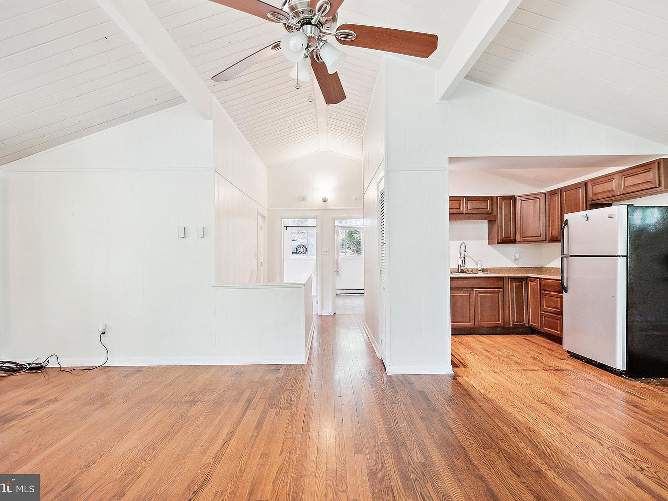 A spacious living room features high, sloped ceilings with exposed beams, enhancing the airy atmosphere. Walls painted in a soft white reflect natural light, while rich hardwood flooring adds warmth. At one end, a modern kitchen is visible, showcasing dark wooden cabinetry and stainless steel appliances, contrasting beautifully with the light backdrop. The open layout promotes flow and connectivity between spaces. A ceiling fan with light fixtures hangs centrally, providing both style and functionality. Large windows allow ample sunlight, creating an inviting and comfortable environment. Decorative elements can be easily adapted to suit personal taste.