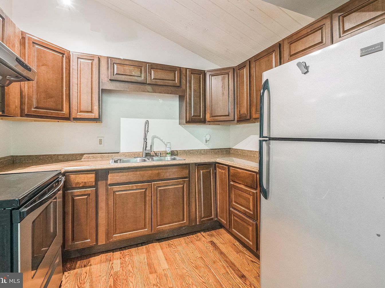 This kitchen features rich, dark wooden cabinetry with a smooth, modern finish. The cabinets provide ample storage space, arranged around a well-designed layout. A sleek countertop complements the cabinetry, featuring a subtle speckled pattern. The kitchen includes a stainless steel stove and a large refrigerator with a glossy surface, both accentuating the clean lines of the space. A distinctive feature is the sloped ceiling, enhancing the openness of the area. Natural light reflects off the surfaces, creating an inviting atmosphere. The warm wooden flooring adds a rustic touch, balancing the contemporary elements effectively.
