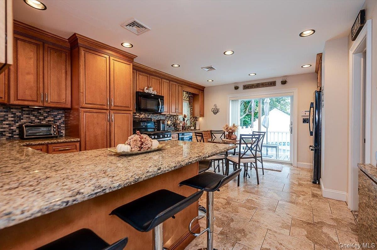 The kitchen features a spacious layout with rich wooden cabinetry that complements the warm tones of the countertops. A large granite island offers seating with sleek black bar stools, creating a casual dining area. The backsplash is adorned with blue and gray tiles, adding a modern touch to the traditional wooden finishes. Natural light floods in through sliding glass doors, leading to an outdoor deck. Decorative elements, like a floral arrangement on the island and wall signage that reads ‘Gather’, enhance a welcoming atmosphere, making this kitchen an inviting space for family and friends.