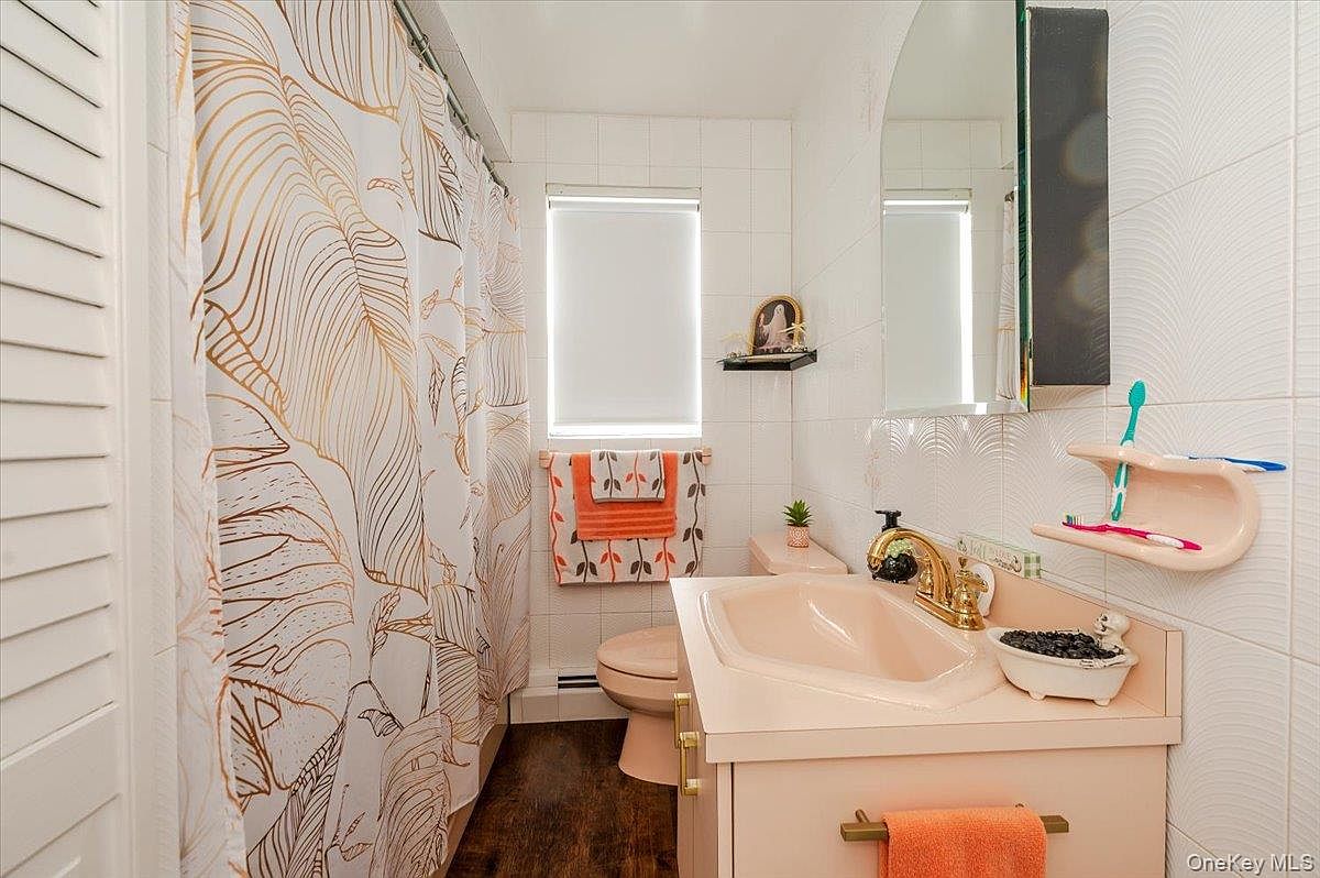This bathroom features a charming, pastel color palette with soft peach and white tones. The layout includes a compact vanity with a curved countertop, complemented by a golden faucet, enhancing the retro aesthetic. A decorative shower curtain adorned with golden leaf patterns adds a touch of elegance, while the patterned towels in vibrant orange and subtle leaf designs create visual interest. A small shelf holds decorative items, including a potted plant. The flooring is dark hardwood, providing contrast against the lighter tones of the tiles and fixtures, contributing to a cozy and inviting atmosphere.