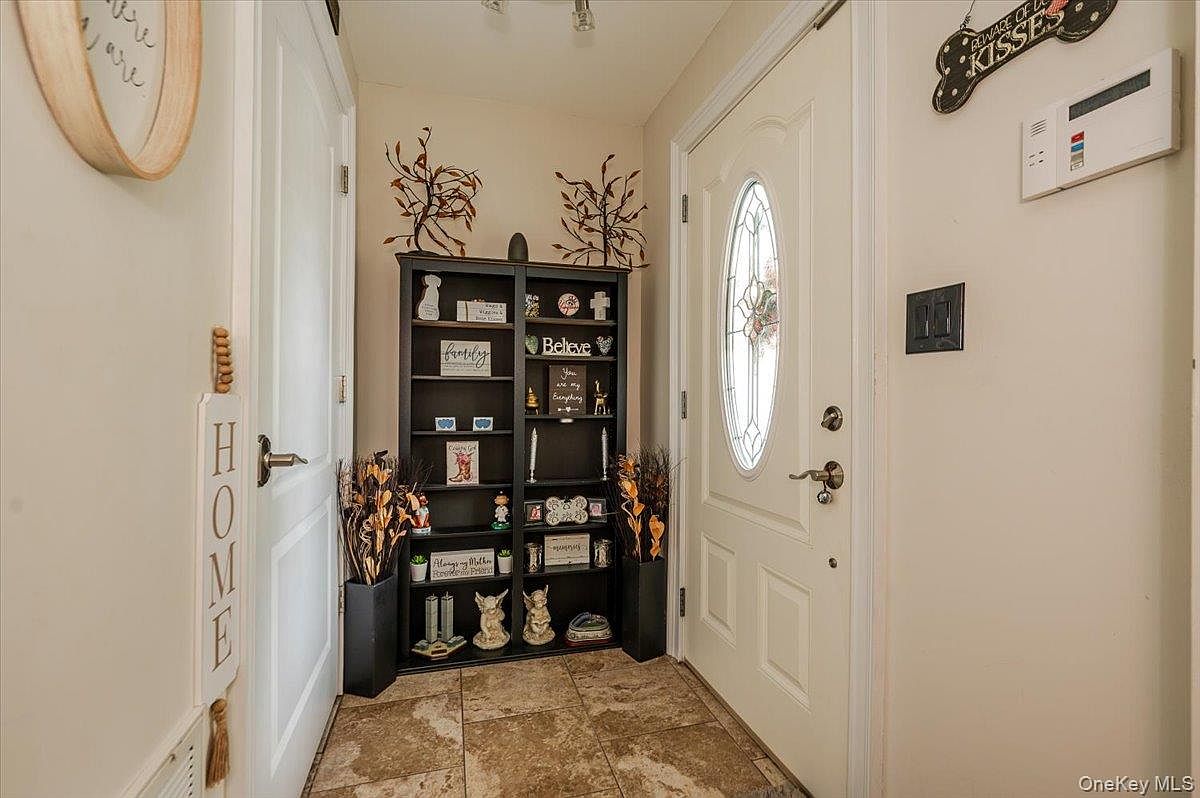 This entryway features a welcoming atmosphere with warm, neutral wall colors that enhance the spacious feel. A stylish door with intricate glass inserts provides natural light. Adjacent, a tall black bookshelf showcases decorative items, including sentimental signs and cheerful accents, creating a personal touch. The floor tiles are a light brown stone, offering a natural texture that complements the decor. On either side of the bookshelf, planters with ornamental grasses and small statues add a hint of nature and whimsy. A ‘Home’ sign hangs elegantly on the wall, enhancing the inviting ambiance.
