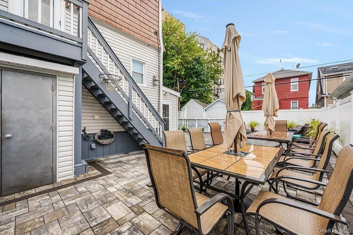 A spacious patio dining area features an elongated table adorned with a polished wooden surface, surrounded by comfortable, cushioned chairs that provide a welcoming atmosphere. The flooring consists of textured stone pavers arranged in a natural pattern, offering durability and aesthetic appeal. Umbrellas stand tall, adding a touch of shade while enhancing the inviting atmosphere. A staircase leads up to a secondary area, indicating multi-level design for utility and space efficiency. A white privacy fence encloses the area, complemented by greenery visible beyond, creating a serene retreat perfect for outdoor gatherings.