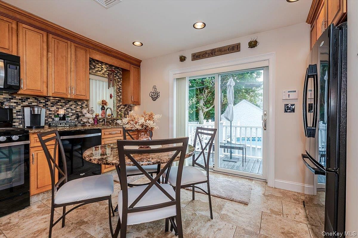 This kitchen dining area blends functionality with modern aesthetics. Light wood cabinetry complements the granite counters, showcasing deep earth tones highlighted by a mosaic backsplash of black, cream, and browns. A round table, outfitted in a glossy finish, pairs elegantly with metal-framed chairs featuring white cushions, inviting casual dining. Large sliding glass doors provide natural light and views of a deck, enhancing the airy ambiance. Decorative elements, such as floral arrangements and a motivational sign, add warmth and personality, creating an inviting atmosphere for both daily meals and social gatherings.