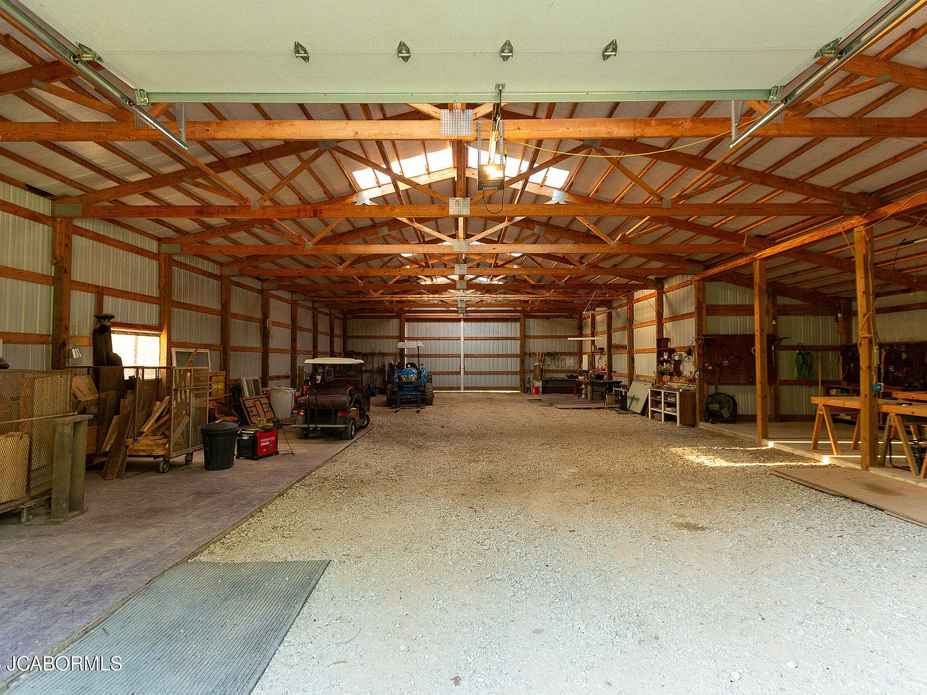 This expansive workshop features high ceilings supported by wooden beams, highlighting a rustic aesthetic. The layout is spacious, allowing for various activities and storage. Natural light enters through skylights and windows, illuminating the location. The floor is gravel, providing a practical surface for heavy equipment and vehicles, visible near the entry. Storage shelves line the walls, filled with tools and materials, while an organized workbench is positioned against one side. The overall color scheme consists of warm wooden tones contrasted with the metallic elements of the fixtures, creating a functional yet inviting environment.