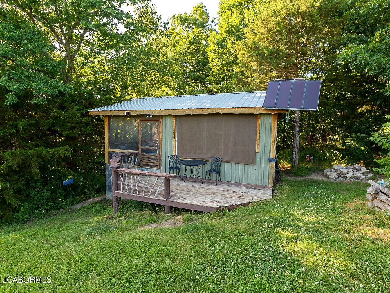 The cabin features a rustic design with wooden siding in soft green hues, harmonizing with the surrounding lush greenery. Its porch, adorned with a wooden railing crafted from branches, creates an inviting entrance. A simple metal roof offers protection while contributing to the cabin’s charm. A small outdoor table with black chairs is set on the porch, perfect for enjoying nature. Sunlight filters through the trees, enhancing the serene atmosphere. A solar panel on the roof signifies eco-friendliness. Nearby, a fire pit encircled by stones invites gatherings, surrounded by grassy areas dotted with wildflowers.