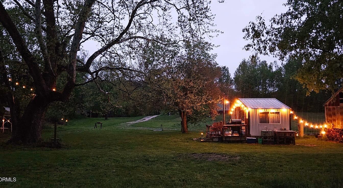 This serene outdoor space features a cozy cabin surrounded by lush greenery, enhanced by warm, glowing string lights. The pathway leads gently into the scene, flanked by mature trees that add a sense of tranquility. The cabin has a simple, rustic design with a metal roof and wooden decking, inviting relaxation. A picnic table sits nearby, offering a perfect spot for outdoor dining. In the background, soft grass blankets the ground, while the ambient light from the strings casts a welcoming glow, creating an inviting atmosphere for evening gatherings under the stars.