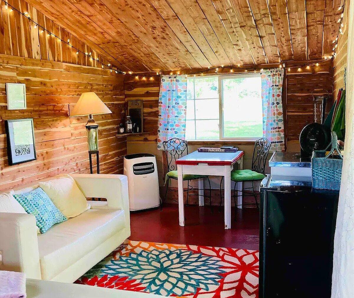 This space showcases a charming, rustic cottage aesthetic with wooden walls and a sloped ceiling, enhancing its cozy atmosphere. The color scheme combines warm wood tones with bright accents like a patterned area rug featuring vibrant floral designs. A soft white sofa offers comfort, complemented by pastel throw pillows. The dining area features a small white table surrounded by intricate iron chairs, adorned with green cushions. Decorative string lights add a warm glow, while playful curtains introduce color and whimsy. A portable air conditioner and various decor items complete the inviting setting, perfect for relaxation.