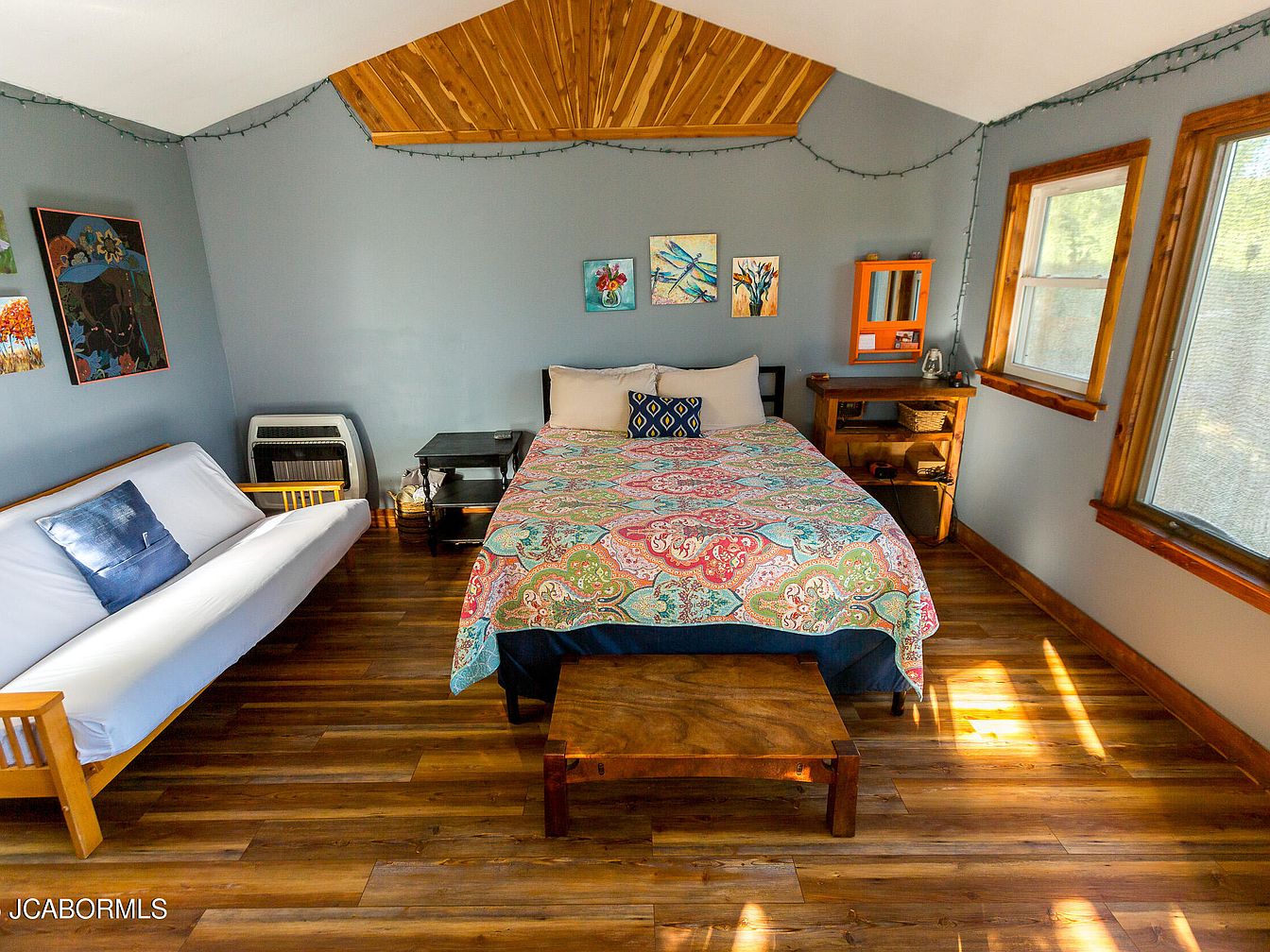 A cozy bedroom featuring a wooden accent wall and warm, natural light from two large windows. A queen-size bed with a colorful paisley quilt is positioned centrally against a soft blue wall. Beside the bed, a dark wood nightstand and an eclectic wooden shelf display decorative items. A futon with a white cushion sits opposite, adding additional seating. The rich, dark wooden floor contrasts beautifully with the lighter wall colors. Artwork hangs above the bed, bringing a touch of personality and vibrancy to the space. String lights add a whimsical touch along the ceiling, enhancing the inviting atmosphere.