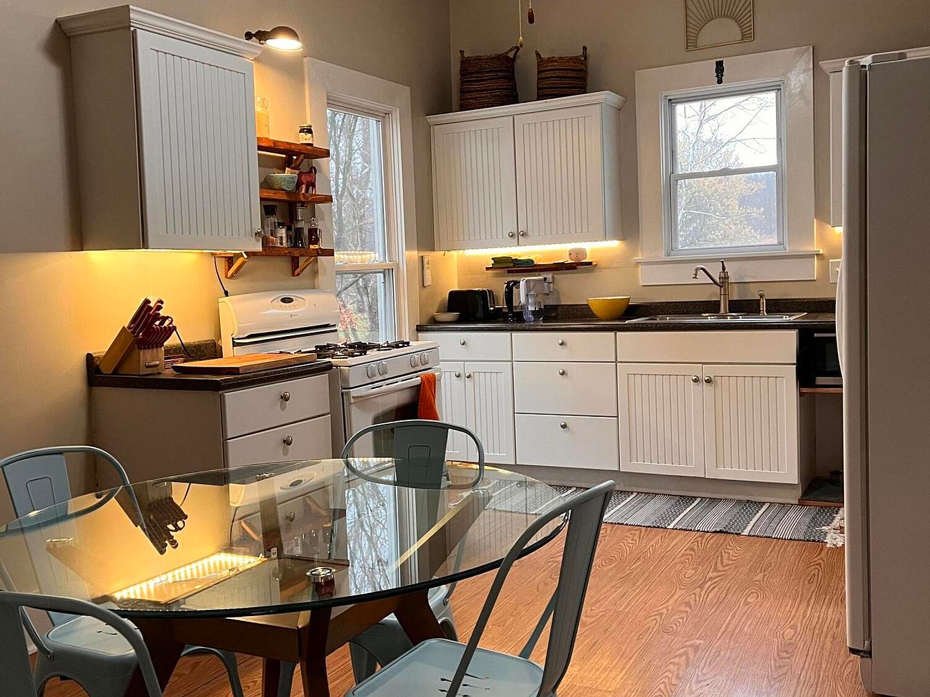 This kitchen showcases a cozy, modern design with light-colored cabinetry featuring textured paneling. The countertops are dark, creating a striking contrast against the white cabinets. A gas stove sits prominently, flanked by sleek appliances and a bowl for fresh produce, enhancing functionality. Under-cabinet lighting casts a warm glow, emphasizing the cozy atmosphere. A round glass dining table with metal chairs occupies the center, inviting casual meals. Natural light streams through the window, illuminating the space. The wood flooring adds warmth, while decorative shelf elements above the counter create personalized touches, blending style with practicality.