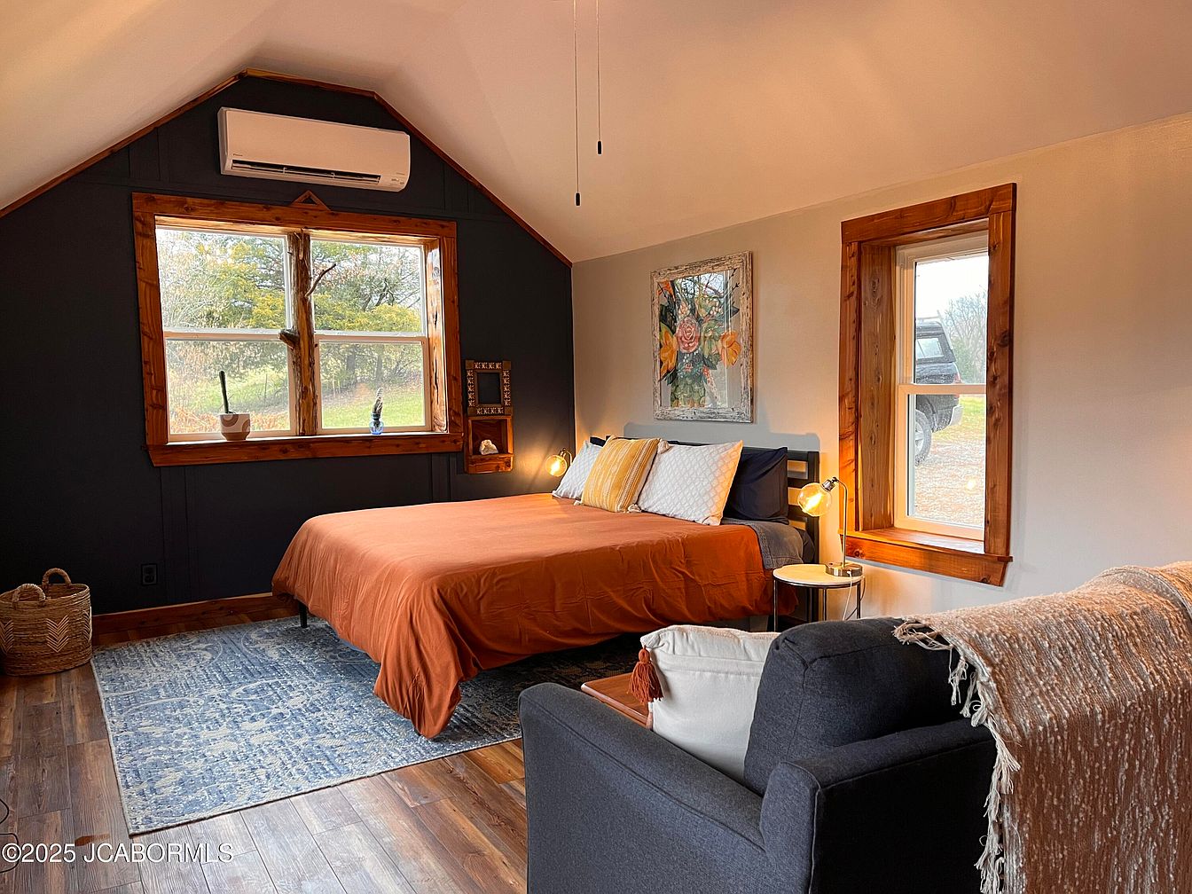 This cozy bedroom features a predominantly dark wall, which contrasts beautifully with the warm, inviting orange bedspread. A mix of textures is evident, from the soft bed linens to the woven basket beside the bed. Large windows adorned with wooden frames facilitate abundant natural light, highlighting an earthy color scheme that promotes relaxation. An abstract floral artwork adds a splash of color above the bed, while a small, stylish lamp beside the bed provides task lighting. The rustic wooden flooring complements the overall aesthetic, and a plush area rug adds comfort, creating a harmonious and tranquil atmosphere.