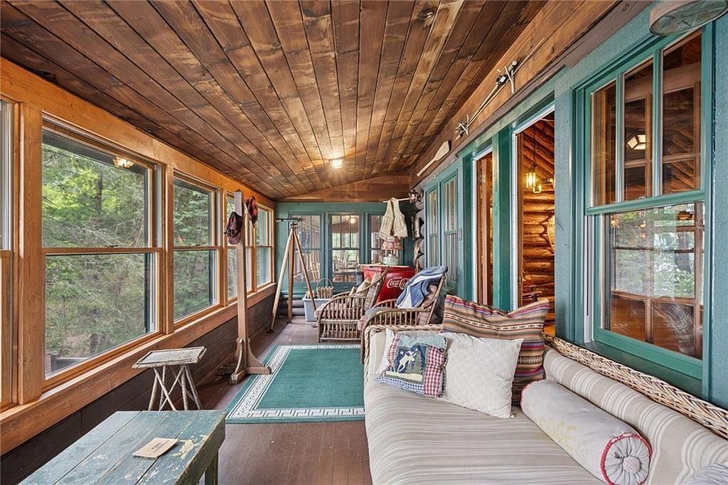 This sunroom features a warm, rustic charm with its rich, wooden ceiling that complements the cozy atmosphere. Large windows adorned with teal frames allow ample natural light, while offering views of the surrounding greenery. A comfortable sofa, covered in a mix of patterned cushions, invites relaxation. Adjacent, a simple wicker chair and a small wooden table enhance the seating area. The floor is adorned with a soft, turquoise rug bordered by a white pattern. Items like a Coca-Cola cooler and wall decorations embody a vintage aesthetic, while the overall layout encourages an inviting communal space for leisure.