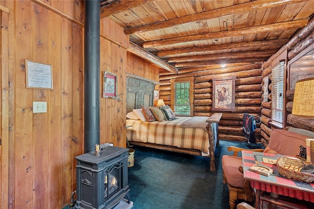 This cozy bedroom features rustic log walls and a warm ambiance. The color palette consists of browns and earthy tones, enhancing the natural wood feel. A plaid bedspread adds a touch of comfort against the wooden bed frame. A small decorative stove positioned near the foot of the bed contributes both warmth and a nostalgic charm. Two distinct seating areas include a cushioned chair and a small table, perfect for relaxation. Sunlight filters through the wooden-framed windows, casting a soft glow, while vintage artwork on the walls enriches the historic character of the space.