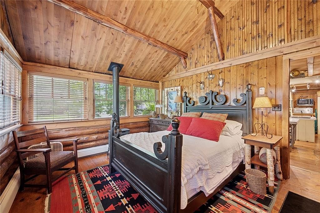 This rustic bedroom features warm wooden walls and a vaulted ceiling that enhances its inviting atmosphere. A black wrought-iron bed with a decorative headboard occupies the center, adorned with red accent pillows that pop against the white bedding. Natural light floods in through multiple windows adorned with wooden blinds, emphasizing the room’s earthy tones. A cozy woven rug adds texture while a simple bedside table holds a lamp, maintaining the room’s understated elegance. The wooden beams and logs create a connection to nature, while an armchair in the corner invites relaxation, enhancing the room’s overall homey feel.