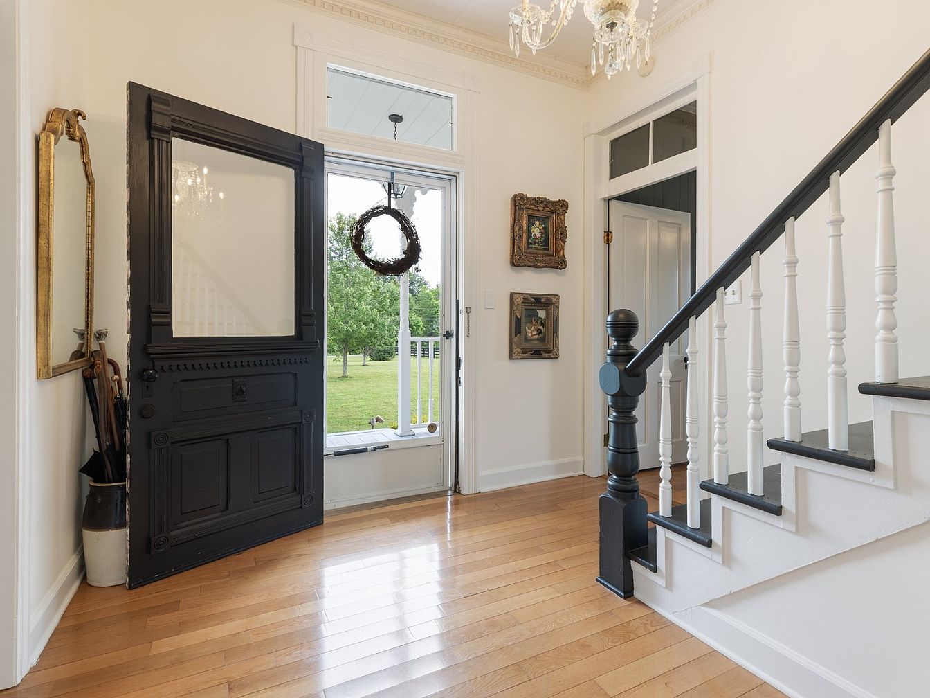 The entryway features a striking black door with intricate paneling, partially open to reveal a lush outside view. The warm, polished hardwood floors contrast beautifully with the white walls, creating an inviting atmosphere. A vintage mirror framed in gold reflects light, complemented by a stunning chandelier overhead. To the left, a staircase with a combination of black and white spindles leads up, accentuating the home’s classic architectural details. Artwork adorns the walls, adding character and charm. Natural light floods the space, enhancing the serene ambiance, while a small umbrella stand adds a practical touch.
