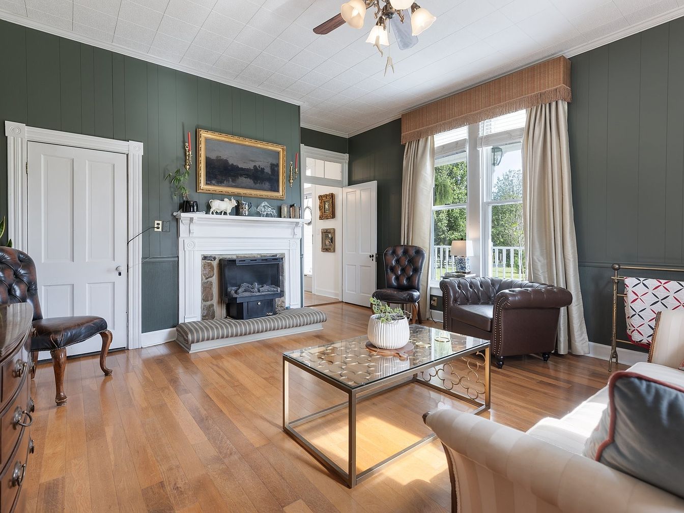 This living room features deep green walls that exude a rich, inviting atmosphere. A stately white fireplace, adorned with a stone base, serves as a focal point, accentuated by a classic painting above it. The hardwood floor showcases a warm, golden hue. Dark leather chairs with tufted detailing provide comfort and elegance, while a striped bench nearby complements the decor. A chic glass coffee table with a geometric design adds a modern touch. Large windows draped with soft, beige curtains allow natural light to flood in, enhancing the overall spacious feel and connection to the outdoor view.