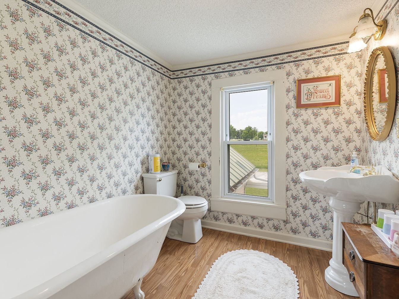 This historic bathroom features a classic design with floral wallpaper adorned in soft pastel colors, enhancing its charm. A freestanding white clawfoot tub sits prominently, complemented by a vintage pedestal sink nearby. Natural light pours in from a window framed in white, offering a view of the outdoor greenery. The wood flooring adds warmth, contrasting the predominantly white fixtures. A round, ornate mirror reflects light, while a small wooden cabinet provides storage. A soft bath mat in a circular shape grounds the space, tying the look together with a whimsical touch. Overall, the bathroom exudes a quaint, nostalgic atmosphere.