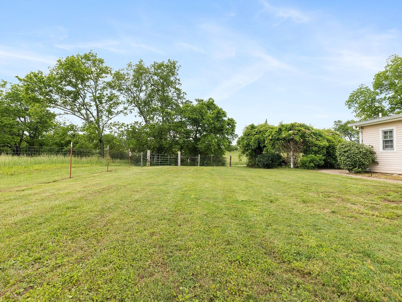 This image presents a serene backyard space, characterized by expansive green grass that appears well-manicured. Lush trees border the area, providing a vibrant contrast against the clear blue sky, enhancing the open atmosphere. A wooden fence stands in the background, secured with metal posts, framing the property while allowing a view into the adjacent landscape. To the right, a charming shrubbery and potentially a trellis add a touch of natural beauty. The overall aesthetic evokes a peaceful, rural charm, ideal for outdoor activities or relaxation, embodying the tranquility of a historic American home.