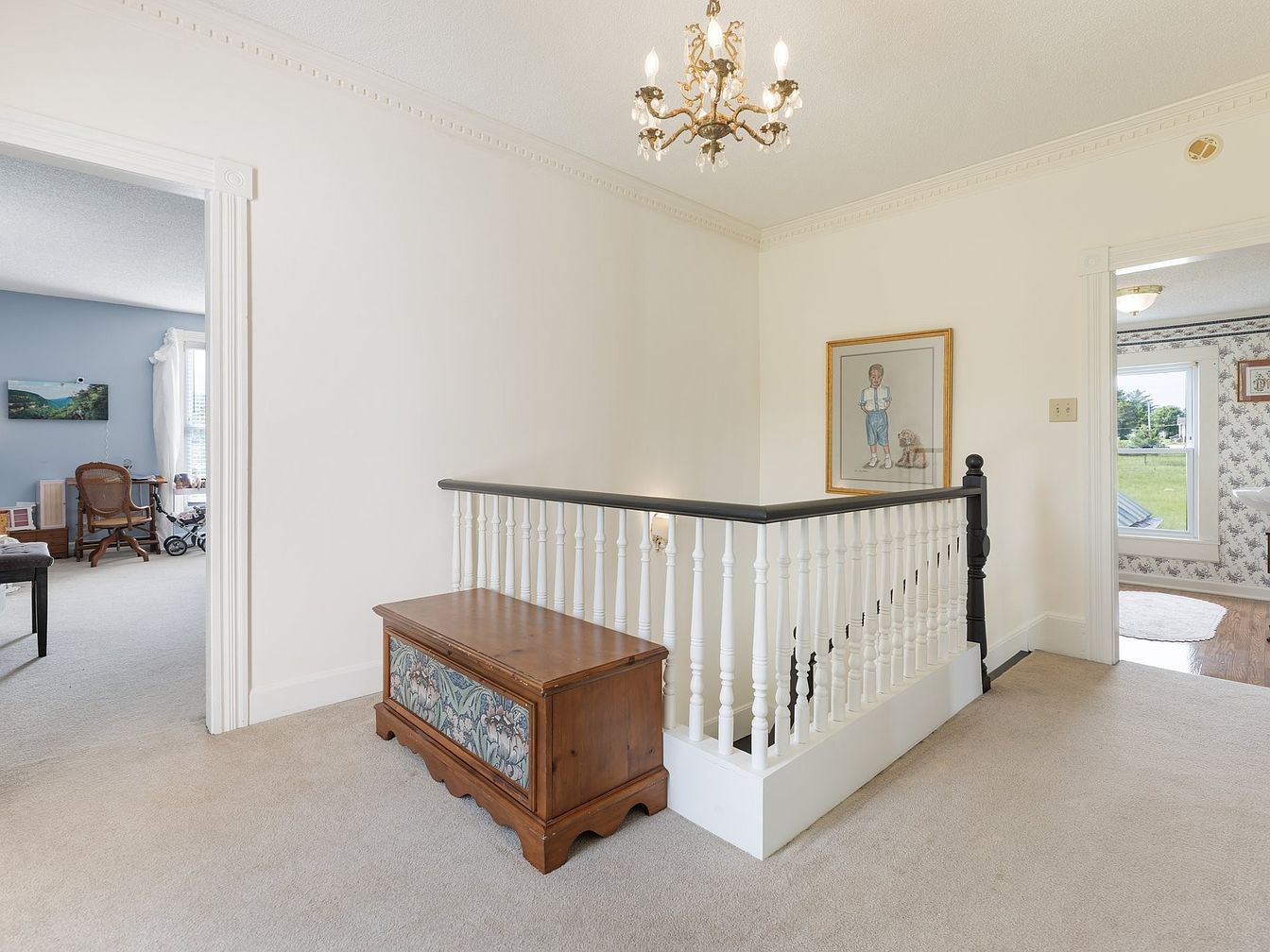 This upper hallway features a bright, inviting atmosphere enhanced by soft beige carpeting. The walls are painted in a light hue, complemented by intricate crown molding and a decorative chandelier, which provides a classic elegance. A wooden bench with floral upholstery adds a touch of charm, while the black and white balustrade creates a striking contrast. On the walls, a framed artwork of a boy with a dog contributes a personal touch. To the left, a doorway leads to a cozy, blue-walled room filled with natural light, connecting the spaces harmoniously.