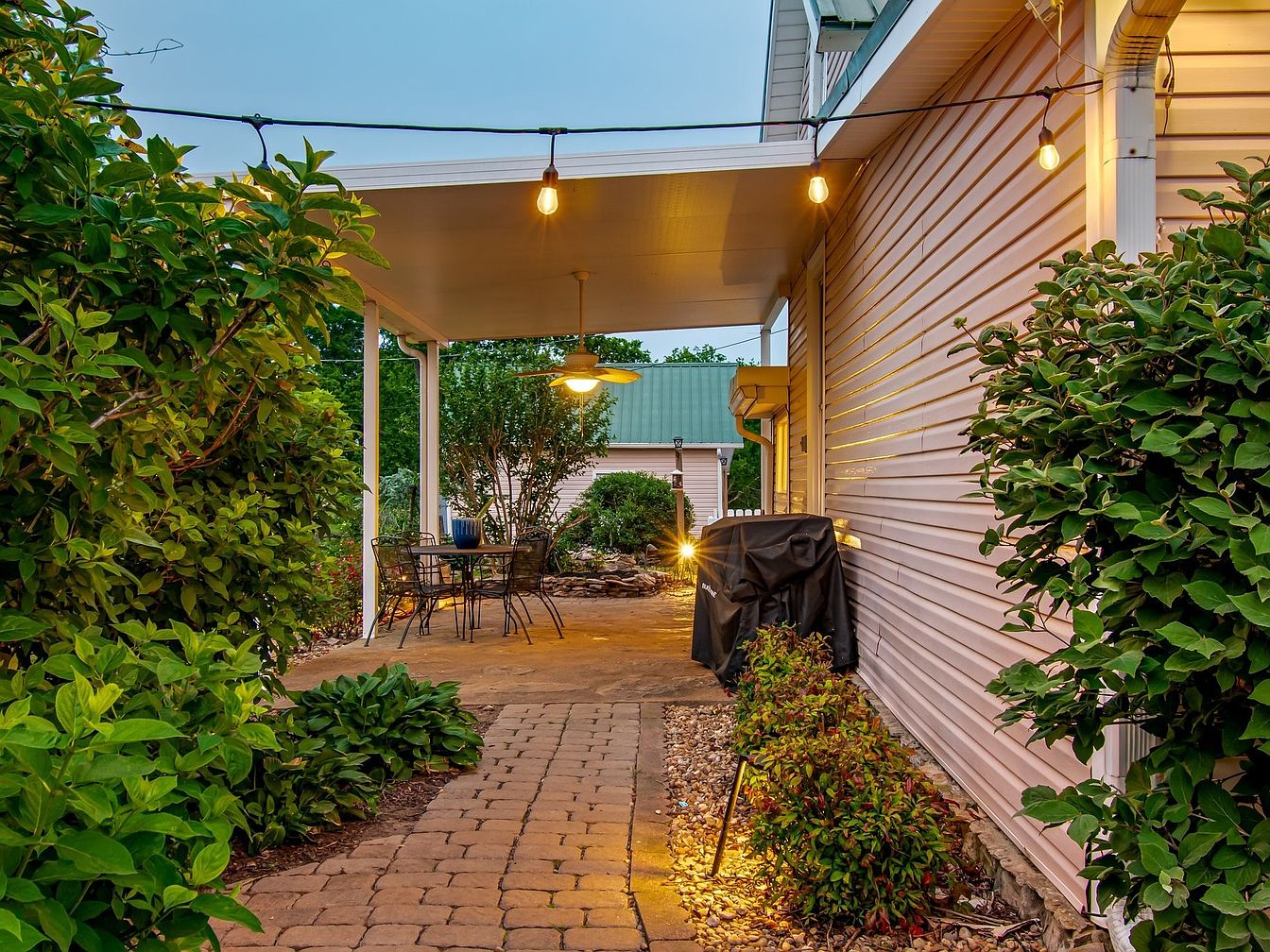 A well-designed patio space features a cozy seating arrangement with a round, metal table surrounded by stylish chairs. The landscape is lush, with vibrant greenery accentuating the space, creating a sense of intimacy. Soft, warm lighting from hanging bulbs casts a welcoming glow, perfect for evening gatherings. A well-maintained pathway made of pavers leads through neatly manicured bushes and vibrant shrubs. A grill is conveniently placed, enhancing functionality for outdoor cooking. The home’s exterior, clad in light-colored siding, complements the greenery, evoking a serene atmosphere while blending seamlessly with the natural surroundings.