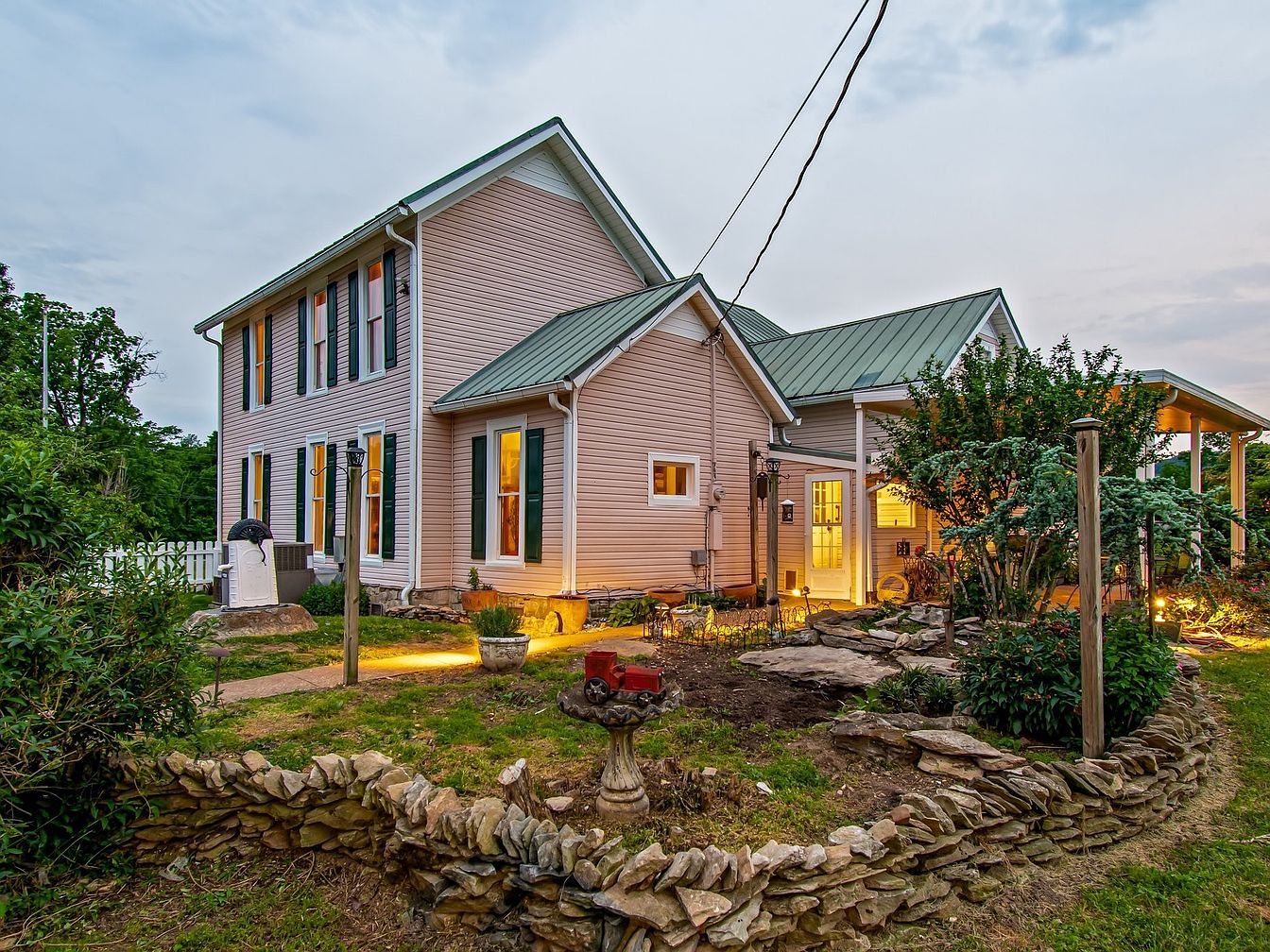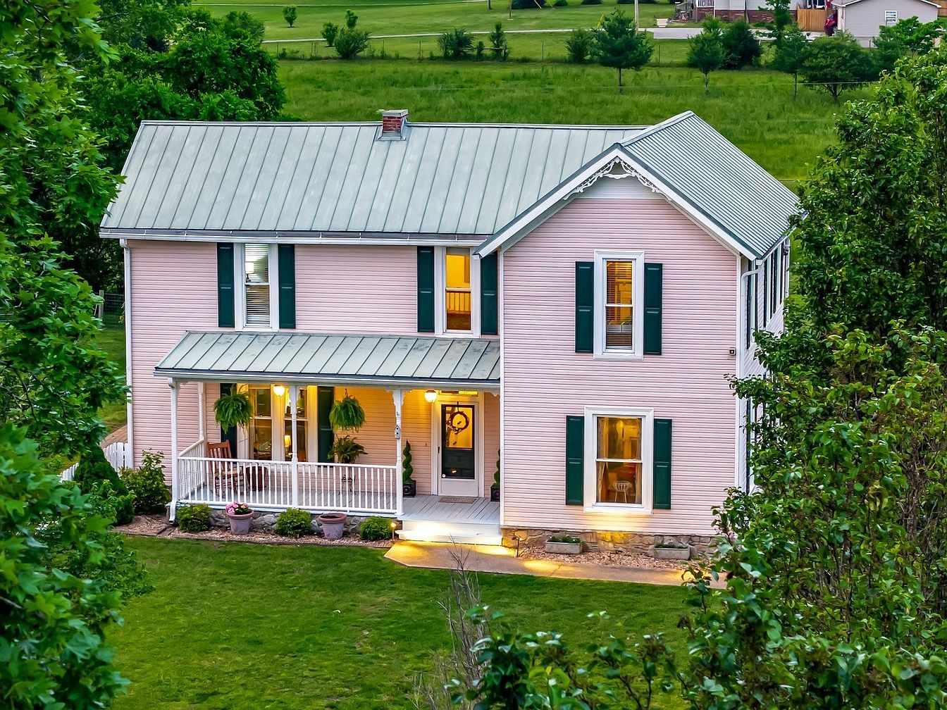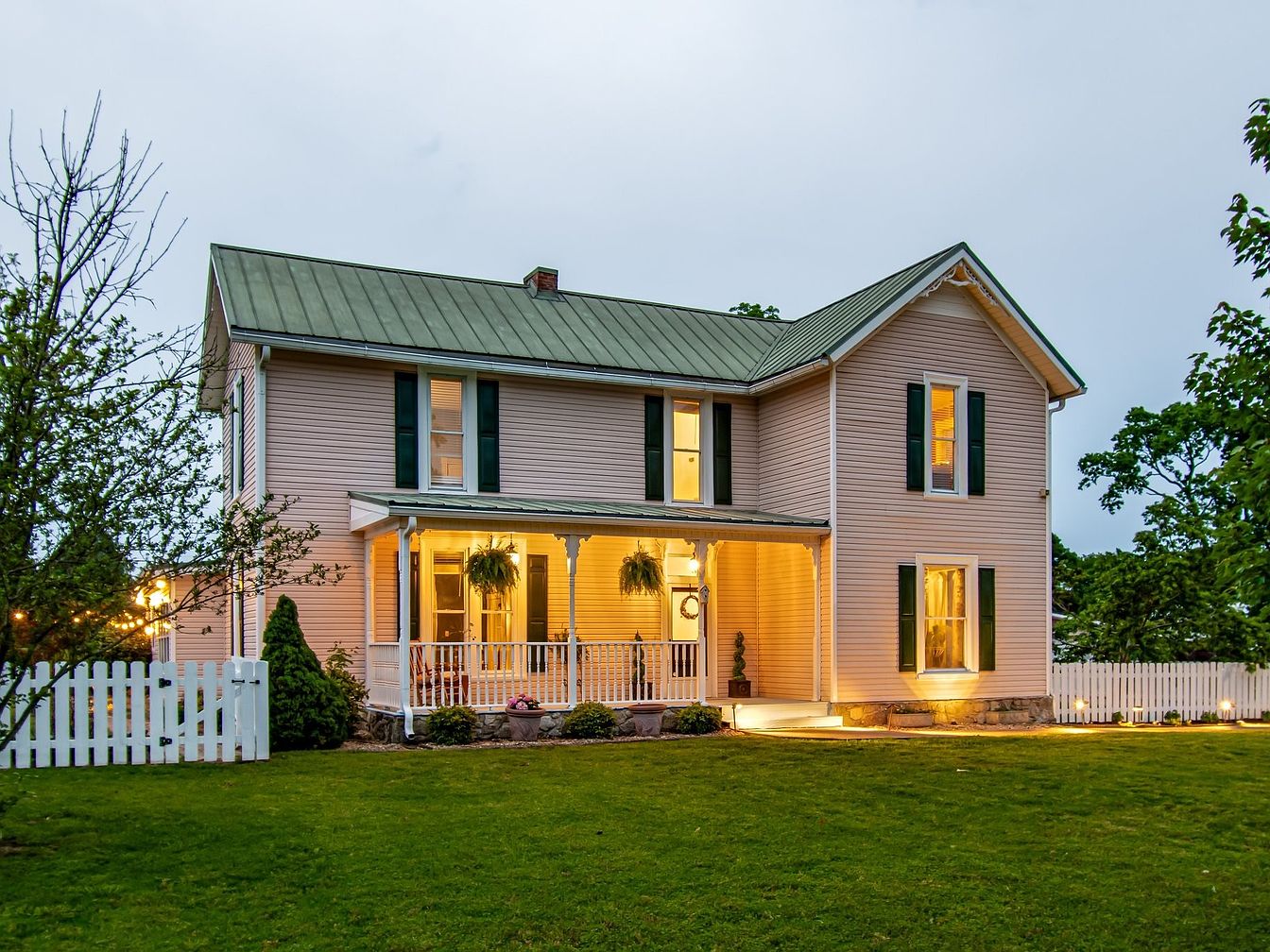 This historic American home features a charming facade illuminated by warm lights from within. The exterior presents a soft pink hue complemented by classic white trim and greenery. A metal roof adds modern appeal to the traditional design. The two-story structure showcases symmetrical windows adorned with dark green shutters. A welcoming porch extends across the front, providing an inviting entryway furnished with potted plants. Surrounding lush green grass, mature trees, and a well-maintained white picket fence enhance the property’s overall aesthetic, creating a picturesque scene that embodies a serene, countryside atmosphere.
