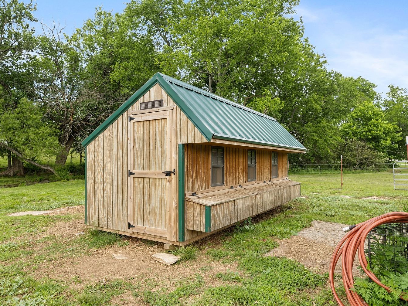 This image showcases a rustic chicken coop set against a backdrop of lush greenery. The structure features a classic A-frame design with a vibrant green metal roof and natural wooden siding, highlighting the use of organic materials. Large windows are strategically placed for ventilation and light, while a set of wooden nesting boxes protrudes from the side, designed for easy access. The coop sits on a slight elevation with a dirt and grassy base, enhancing its farmhouse charm. Surrounding the coop are patches of grass and a coil of garden hose nearby, indicating an agricultural atmosphere.